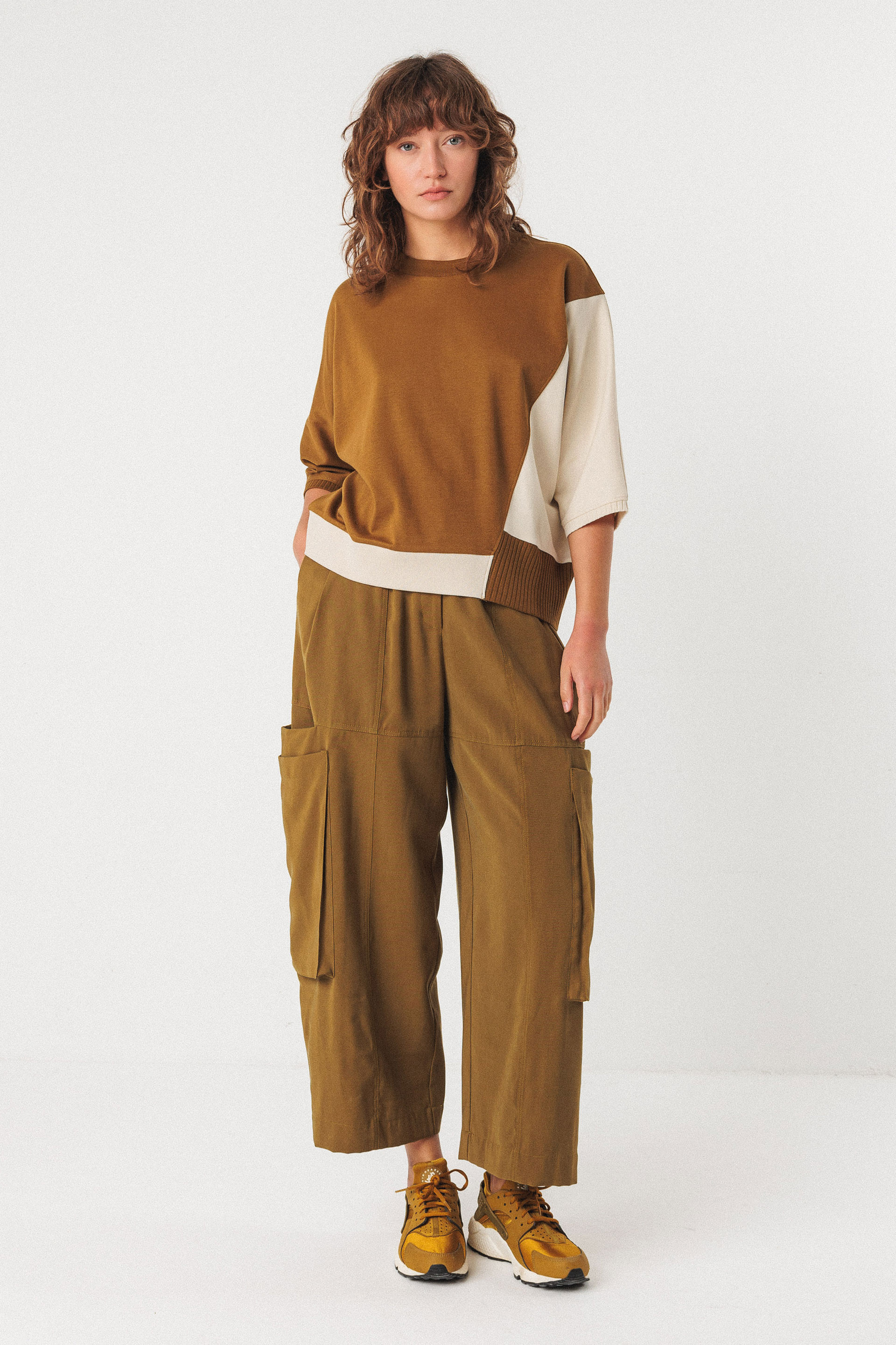 Loose-fitting top with batwing sleeves, asymmetric cut, contrasting panels and ribbed trim.