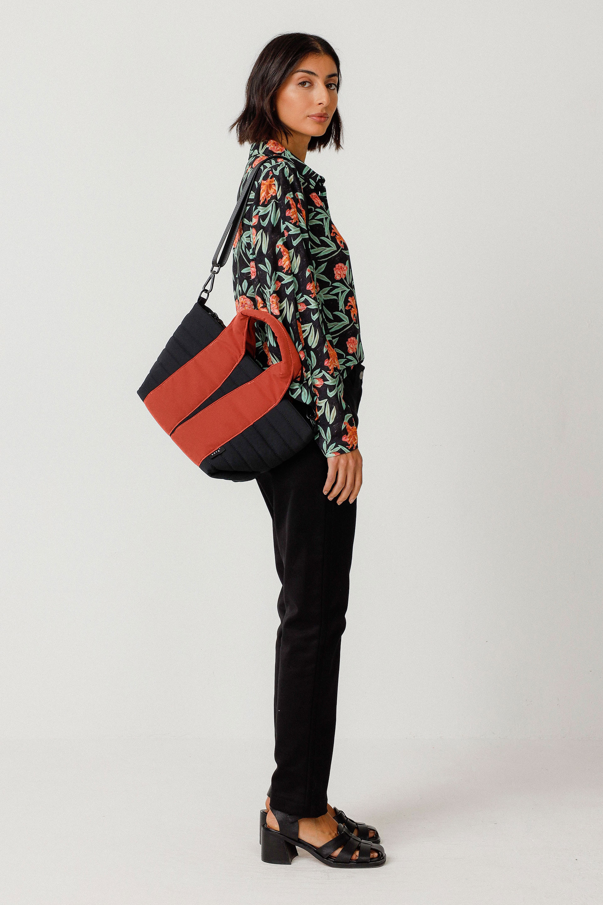 Bolsa de poliéster reciclado con correa ajustable y desmontable, bolsillo interior con cremallera y forro estampado, que mide 350 x 220 x 160 mm.