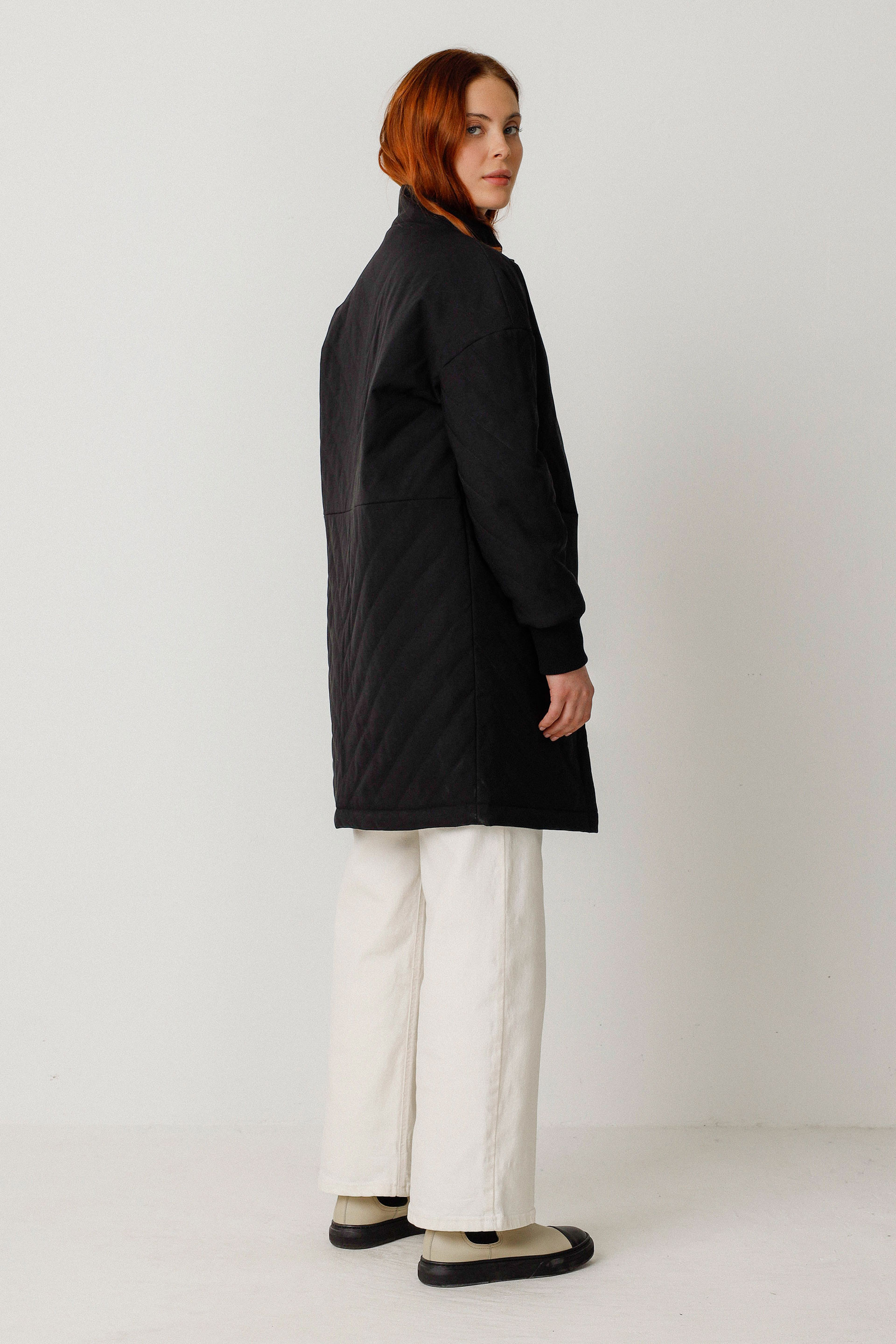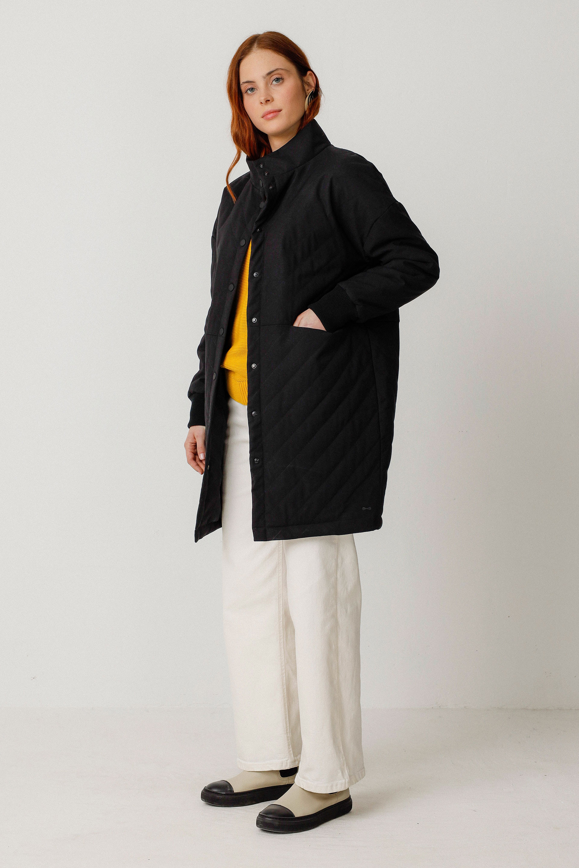 Abrigo de corte cocoon holgado, cuello subido y manga larga con puños de canalé. Tiene bolsillos delanteros, cierre delantero abotonado, está totalmente forrada y lleva un acolchado Sorona.