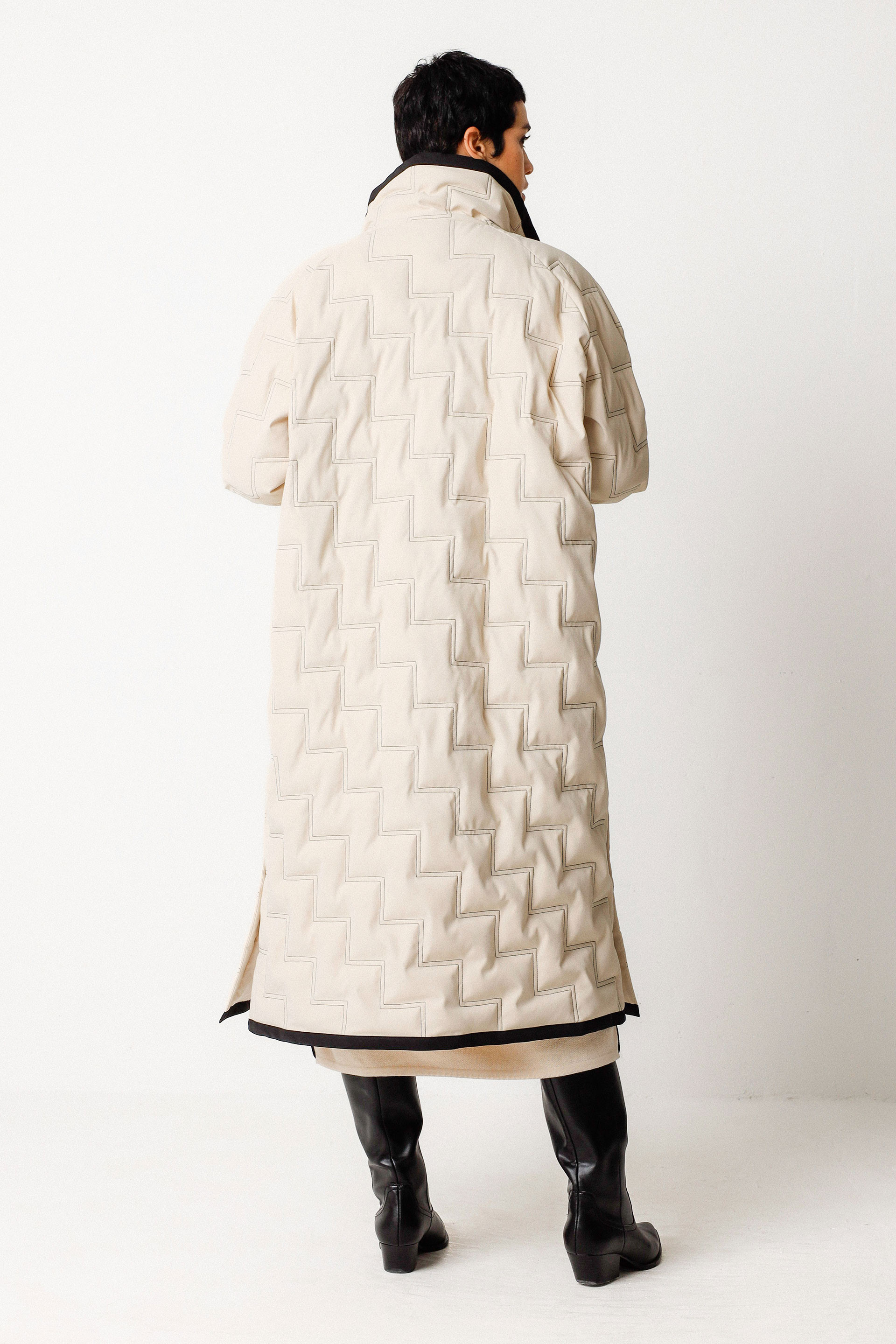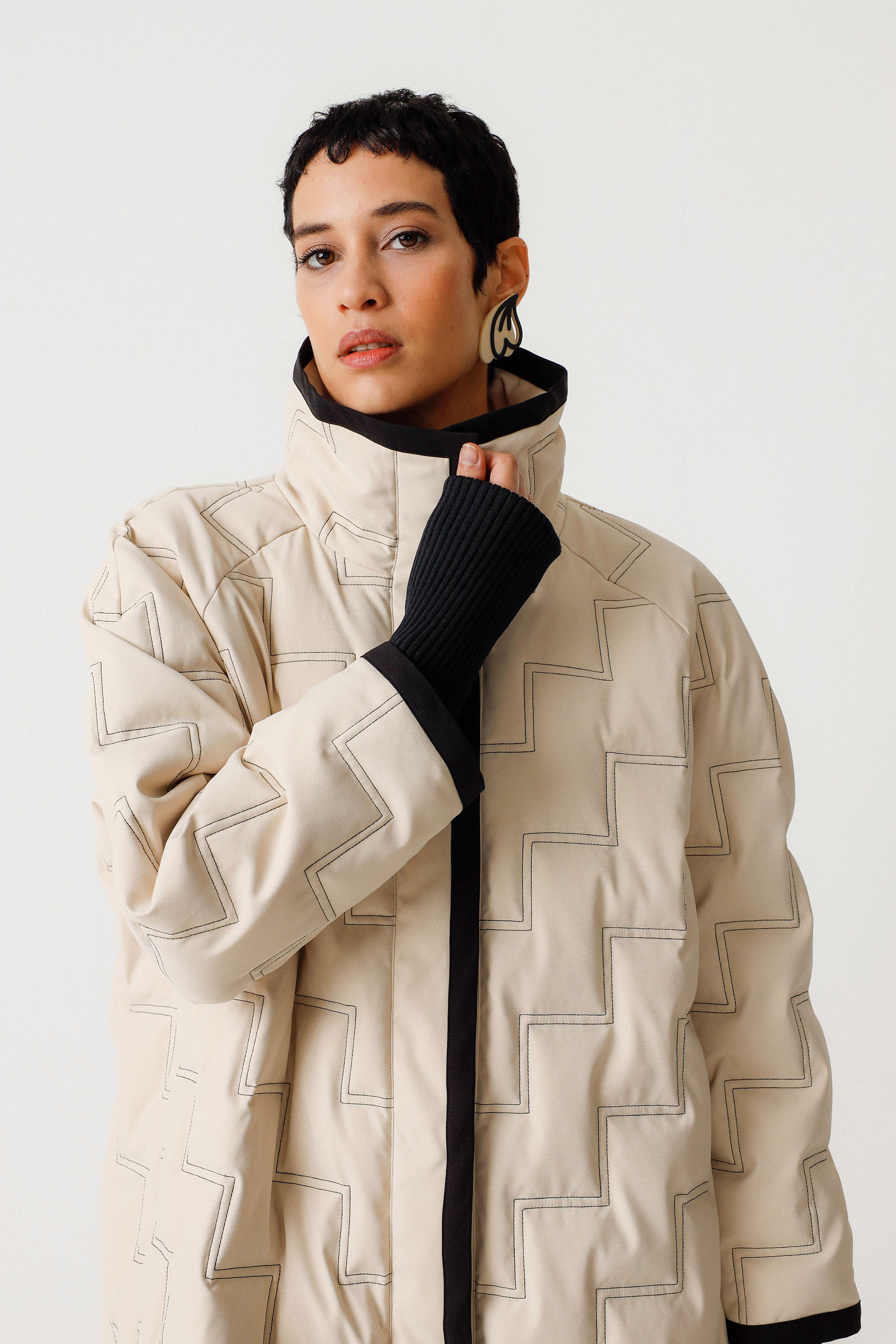Abrigo largo oversize con cuello extragrande, cierre de botones a presión y bolsillos delanteros. Colaboración con Martina Spetlova.