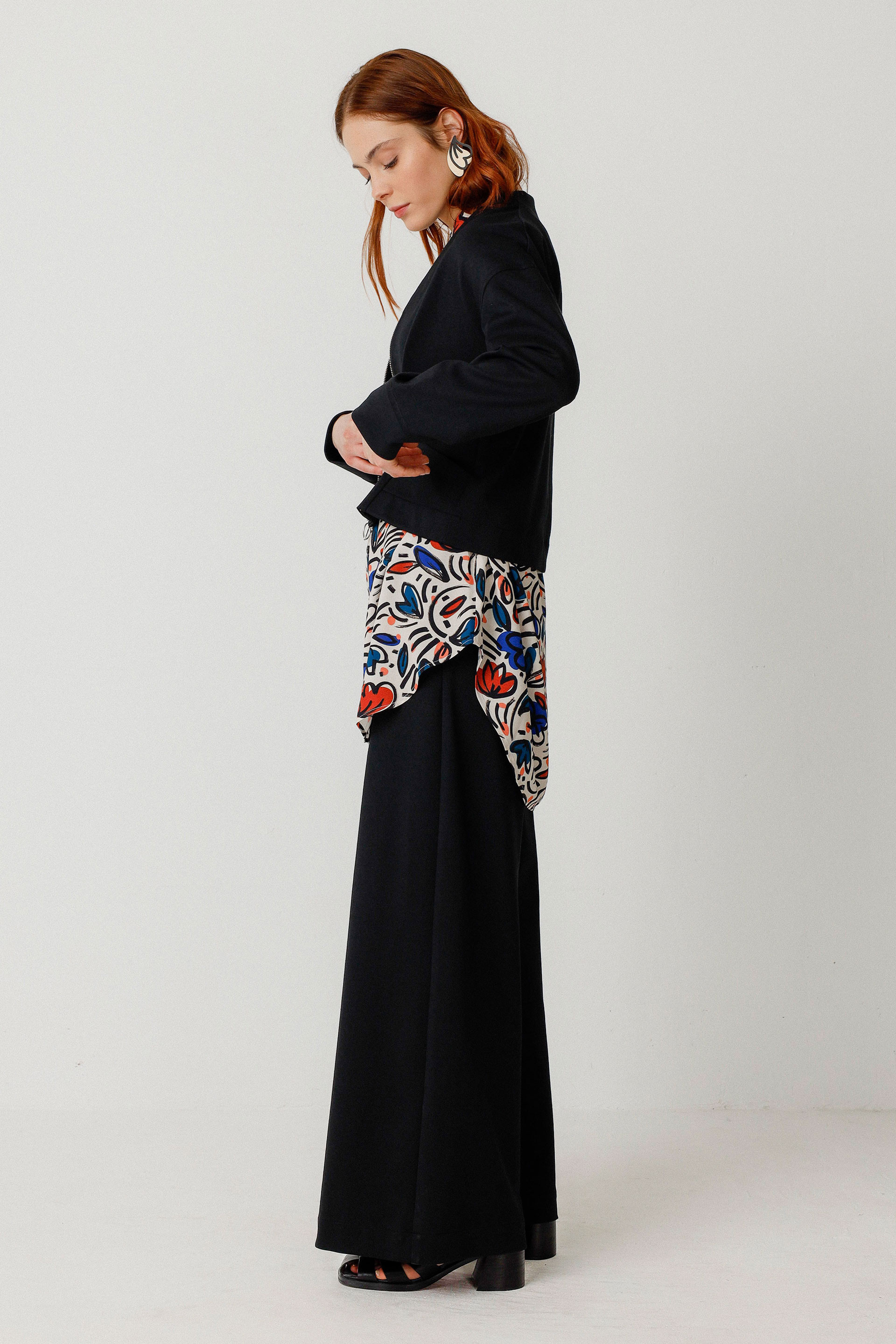 Chaqueta de corte amplio con escote de pico y hombros caídos, de manga larga, con bolsillos delanteros y cierre de cremallera frontal. Combina comodidad con funcionalidad.