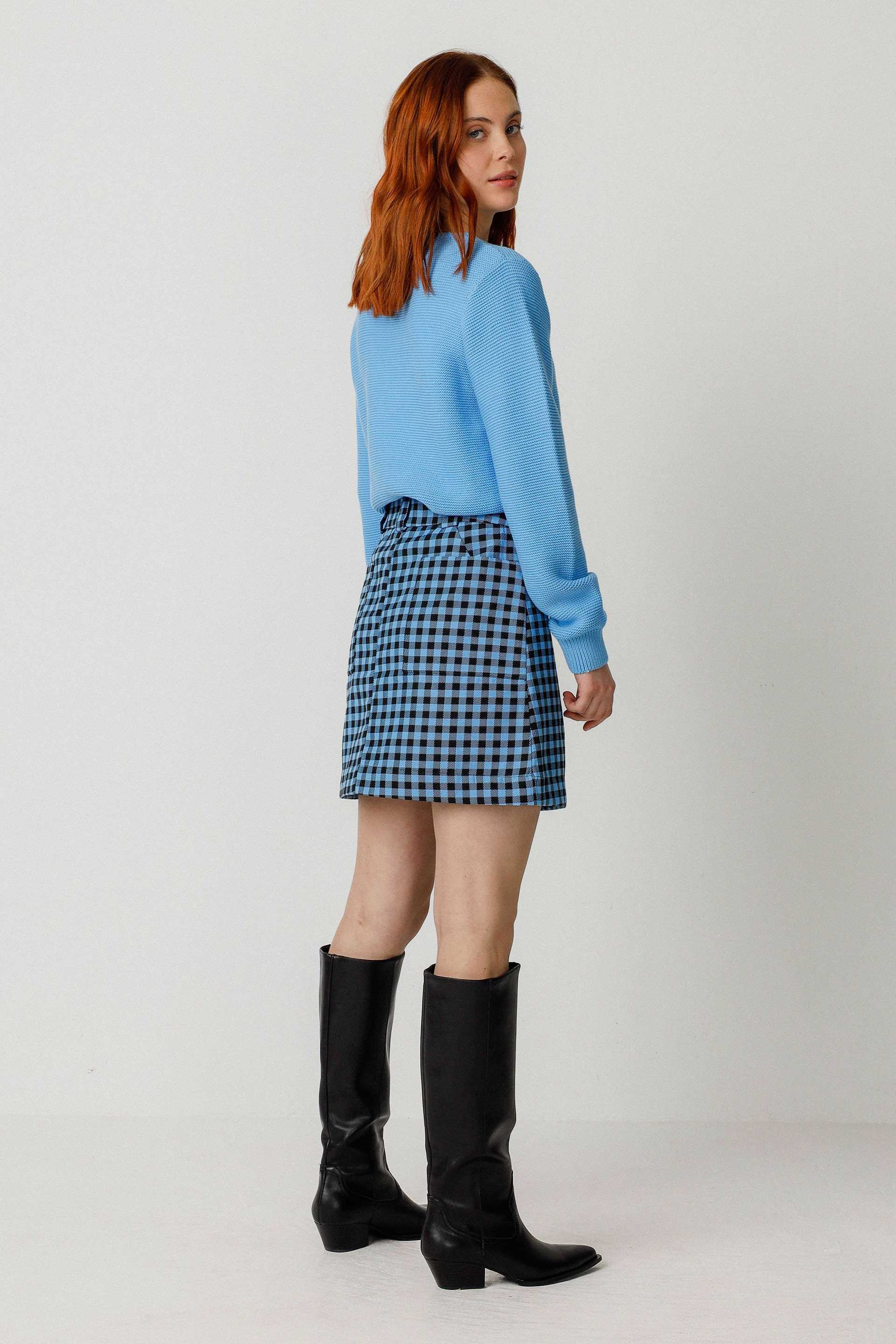 Falda acampanada por encima de la rodilla con bolsillos de parche traseros pespunteados, cierre delantero de cremallera y botón, trabillas de cinturón y tejido jacquard. Combina funcionalidad con un estilo de moda.
