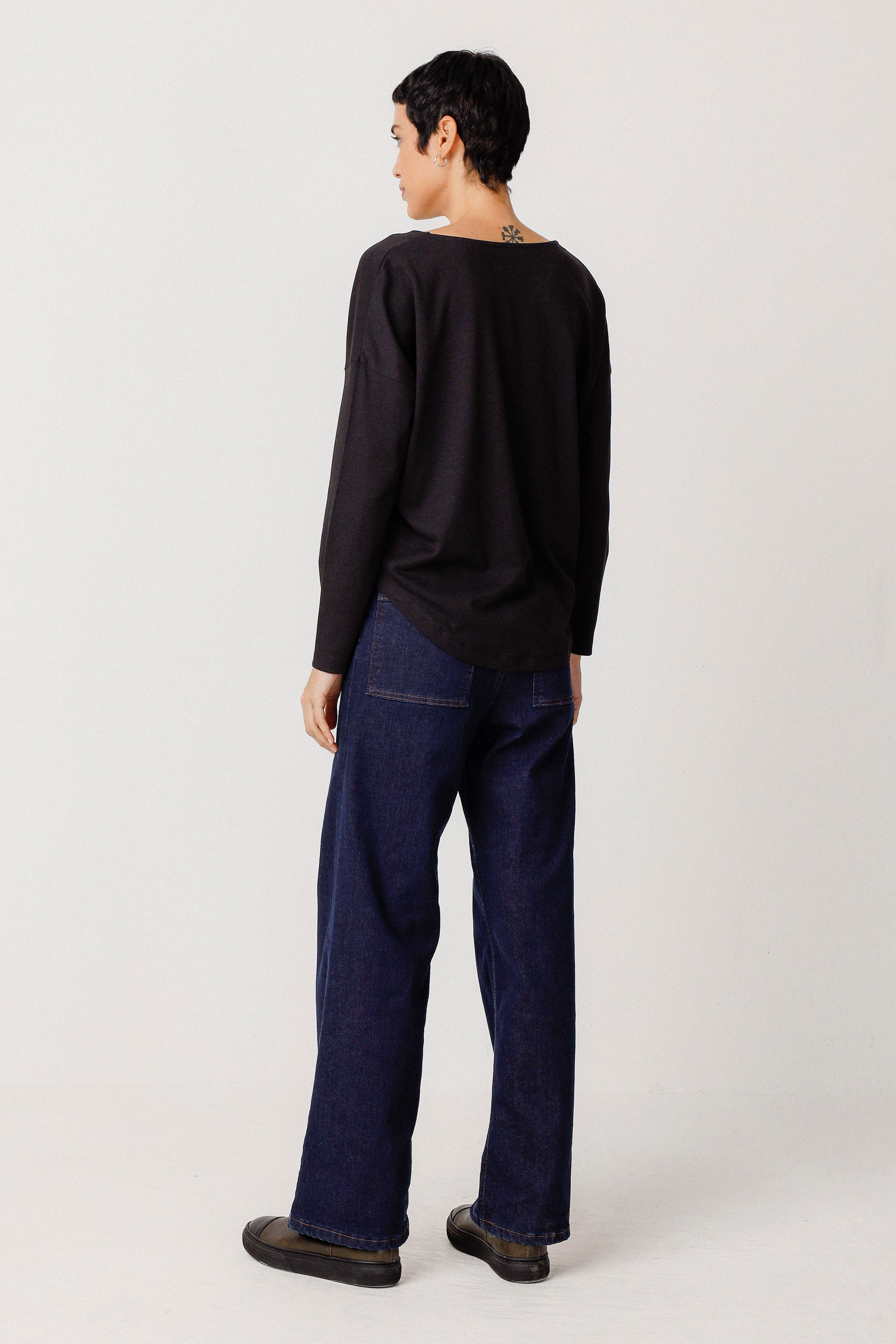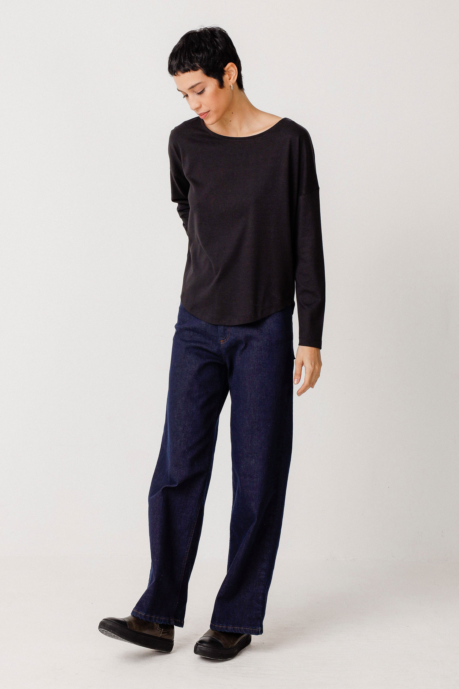 Camiseta holgada de manga larga y cuello barco. Una prenda cómoda y desenfadada para el día a día.