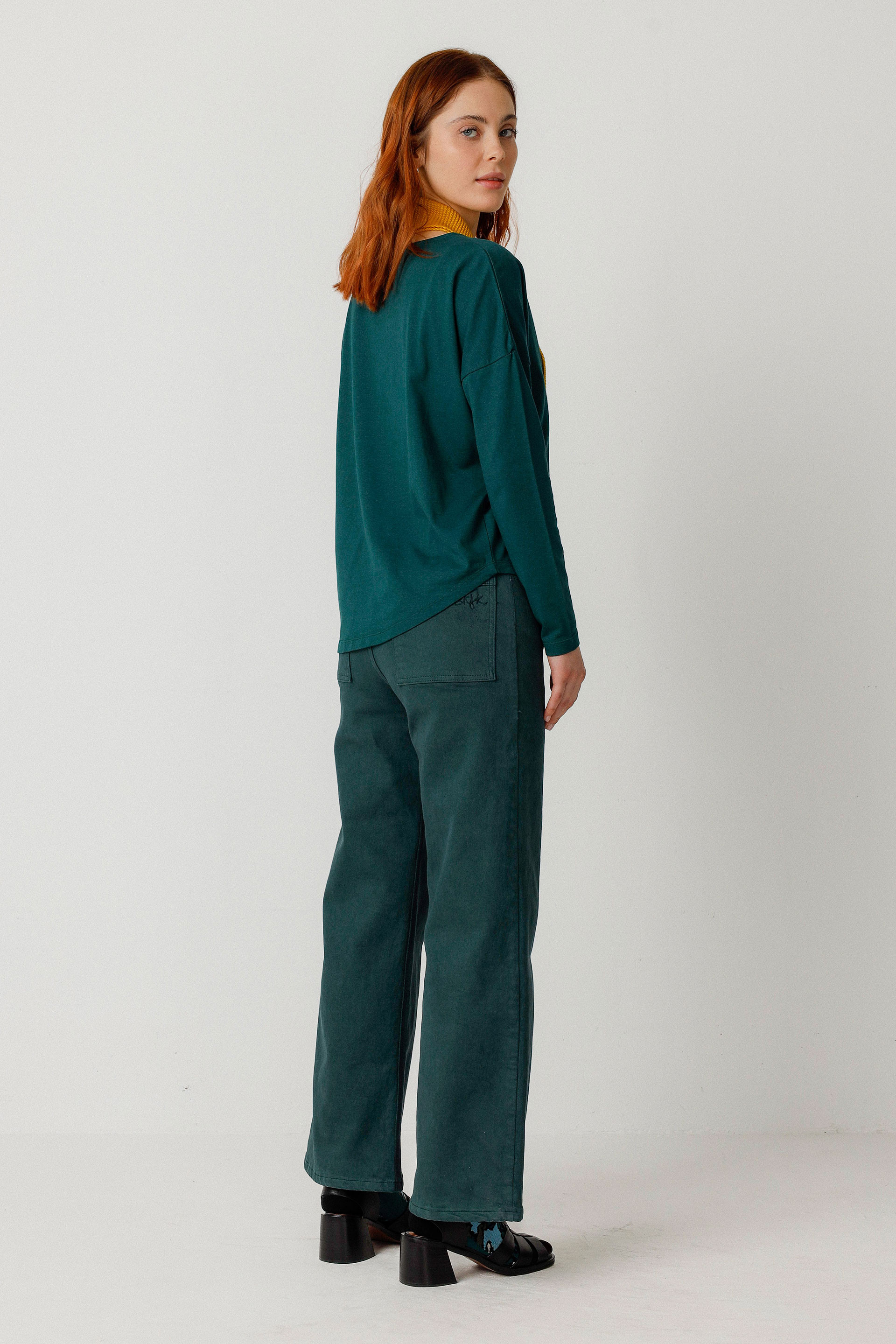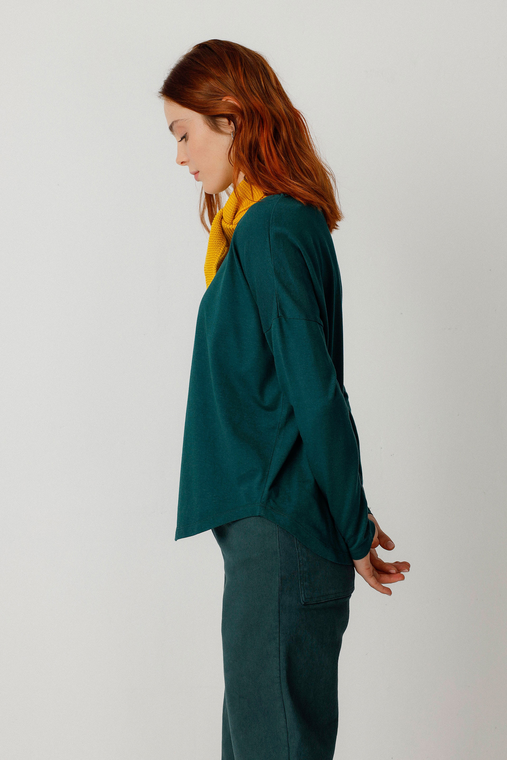 Camiseta holgada de manga larga y cuello barco. Una prenda cómoda y desenfadada para el día a día.