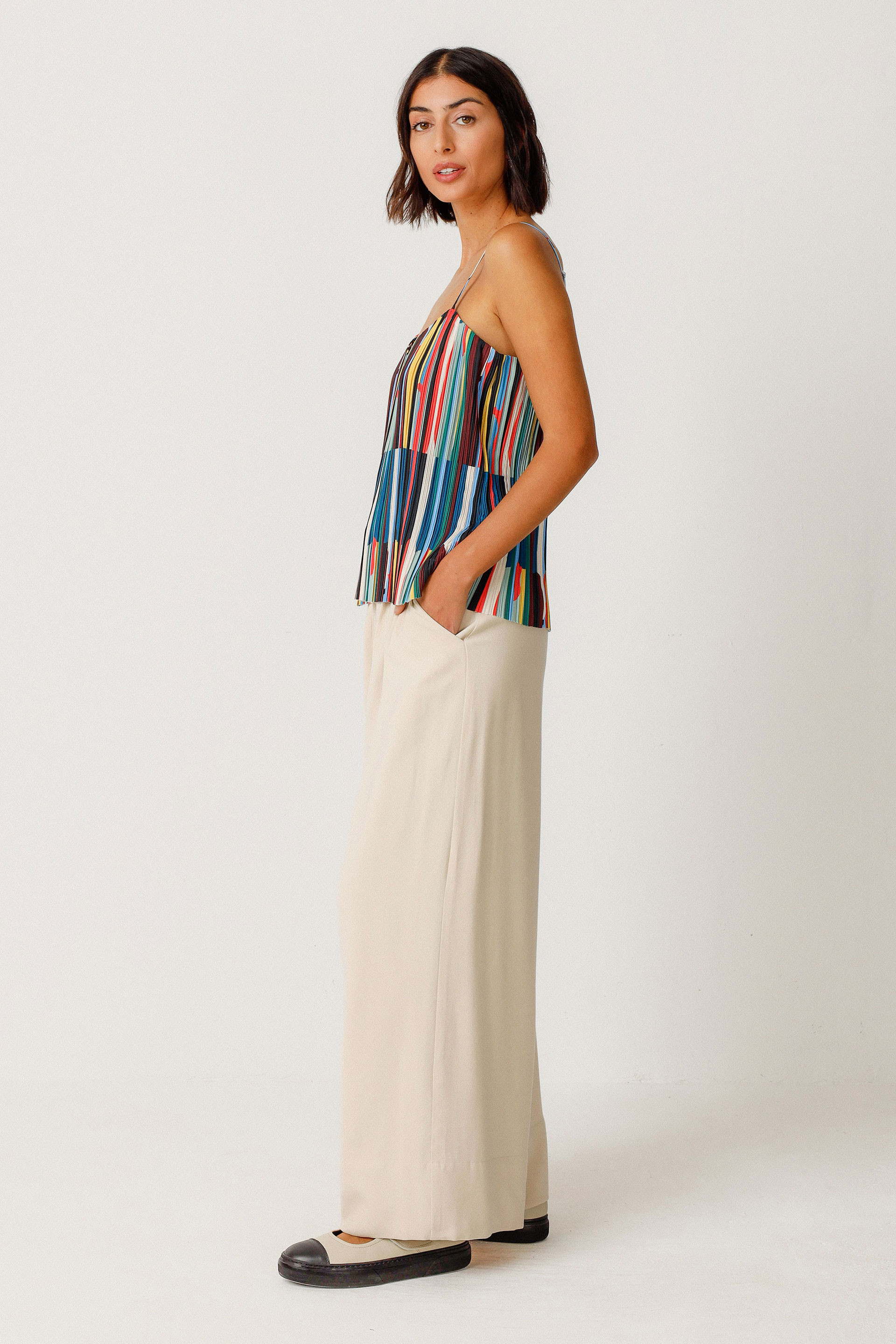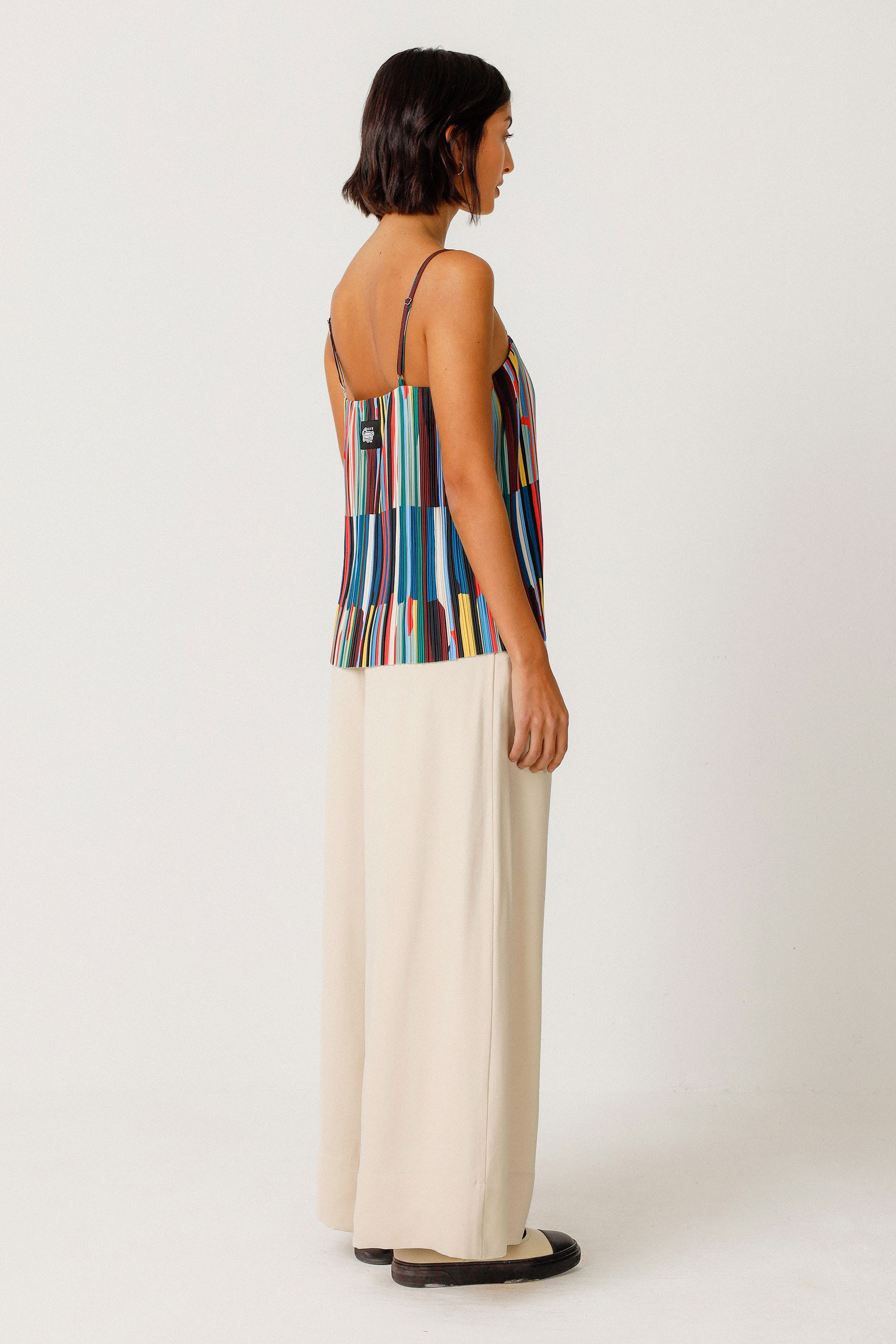 Top corto de corte recto y escote de pico con tirantes finos ajustables de fino tejido plisado. Una prenda con mucho estilo y un look superactual gracias al estampado diseñado en colaboración con Grems.