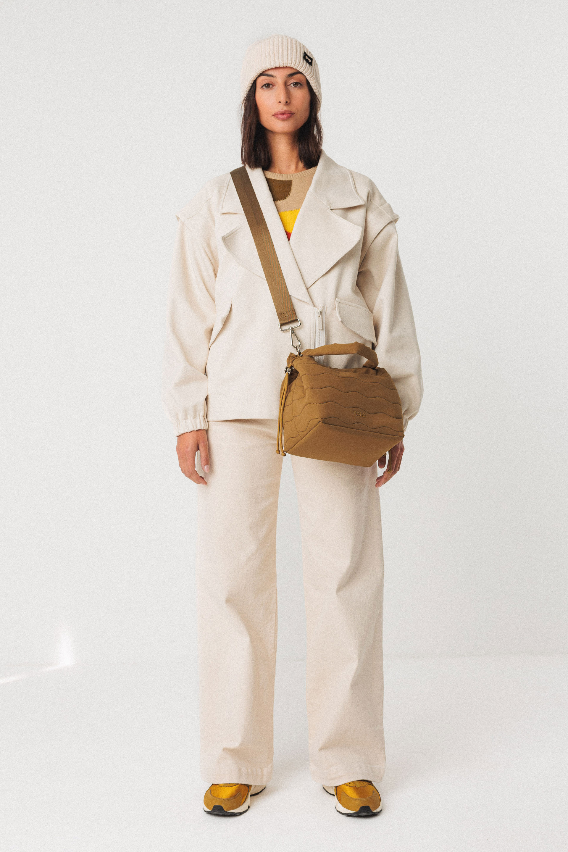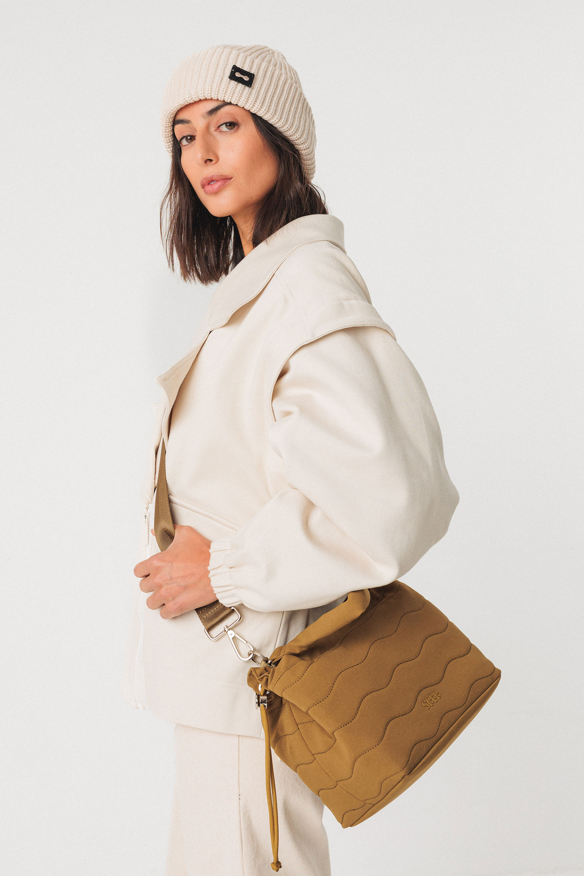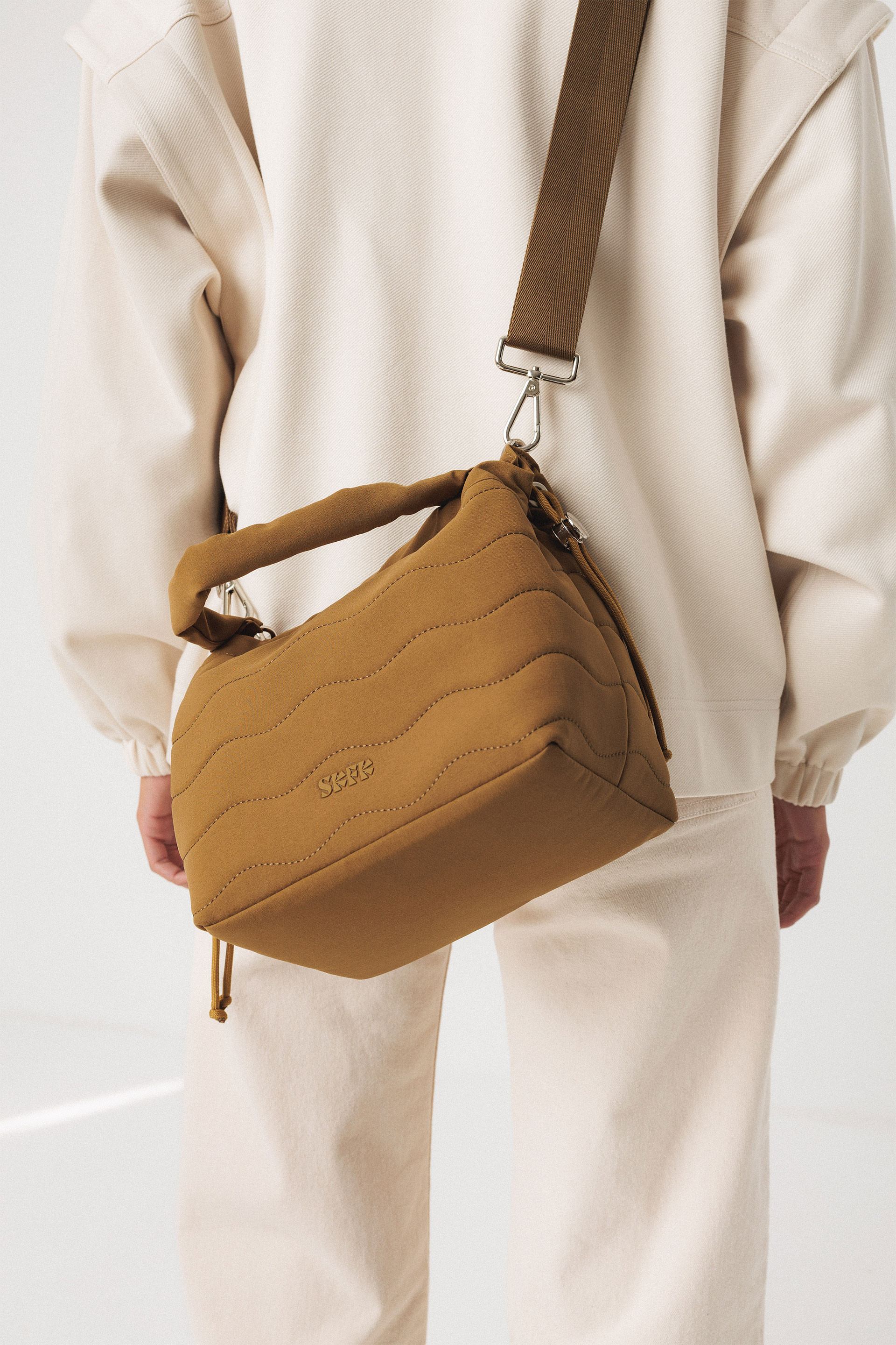Bolso cuadrado ajustable con cordones elásticos en los laterales. Tiene dos bolsillos y se puede llevar en bandolera con la correa ajustable o en la mano con el asa. Medidas: 20 x 20 x 15 cm.