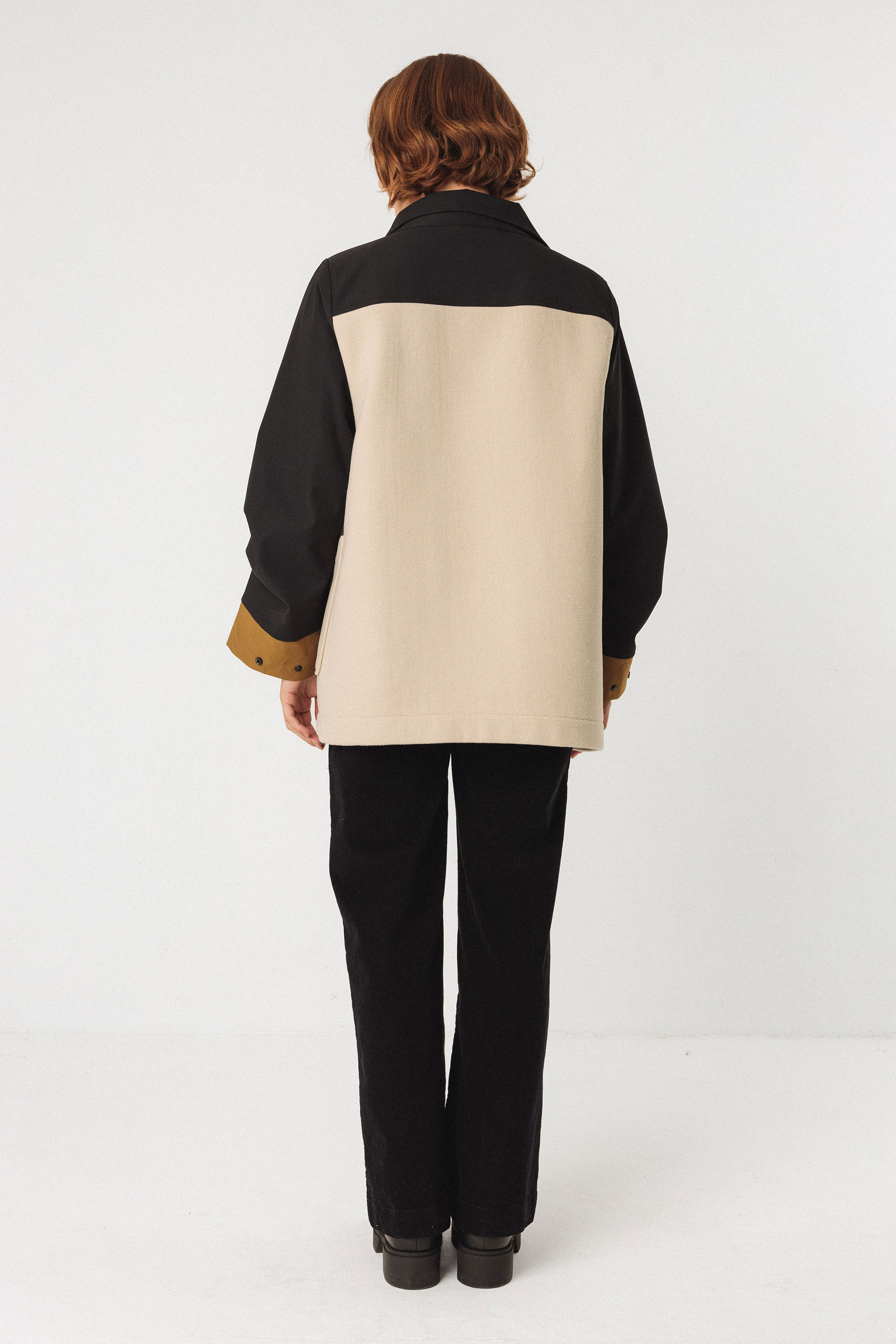 Abrigo envolvente de corte amplio de lana mezclada con distintos materiales y colores. Cierre delantero de cremallera.