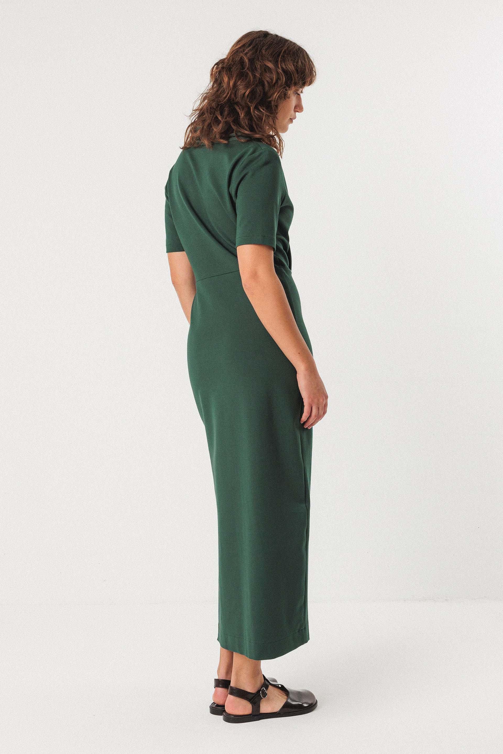 Vestido largo de tela stretch, de corte recto y con el cuello de pico con efecto drapeado. Es de manga corta y tiene un cierre lateral de cremallera.