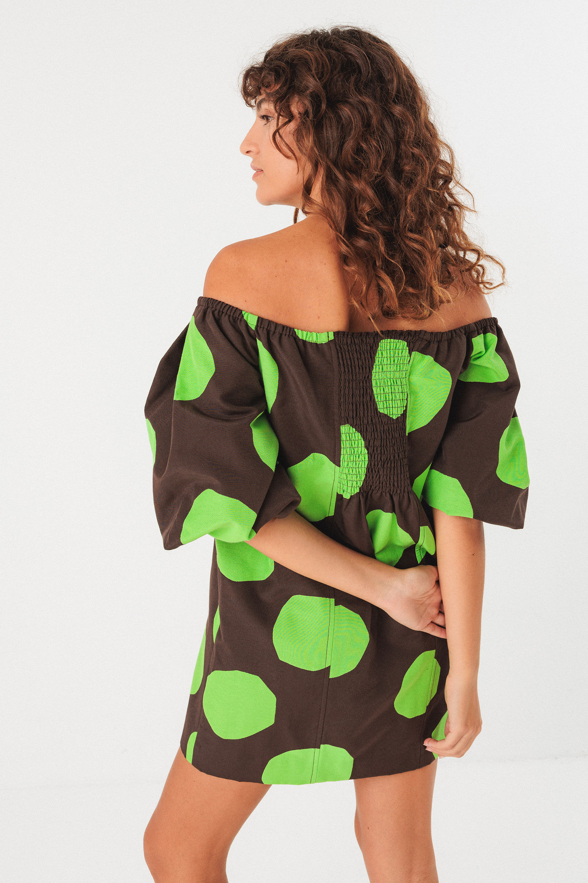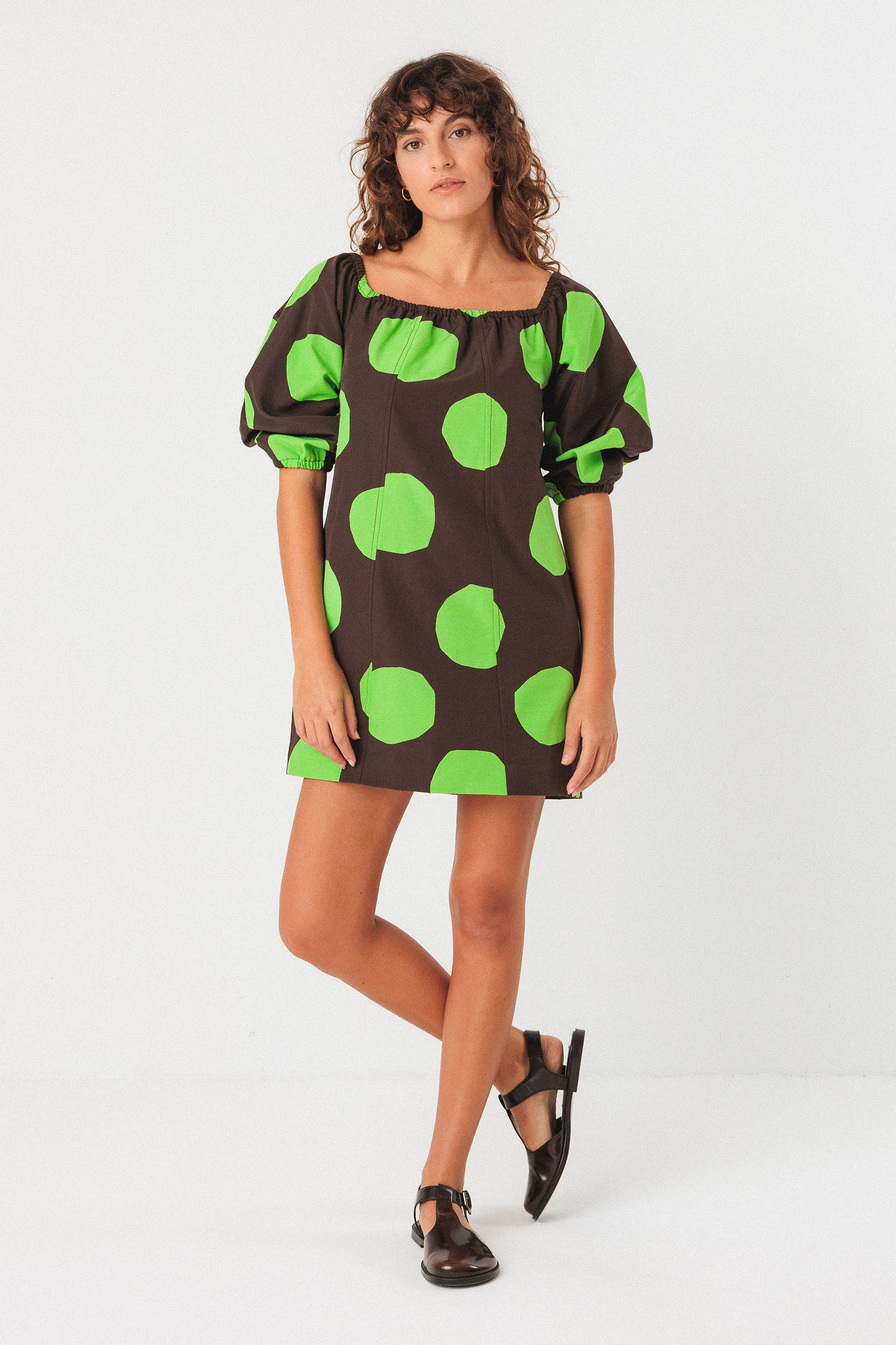 Minivestido de cuello barco elástico y mangas 3/4 abullonadas. Fácil de poner.