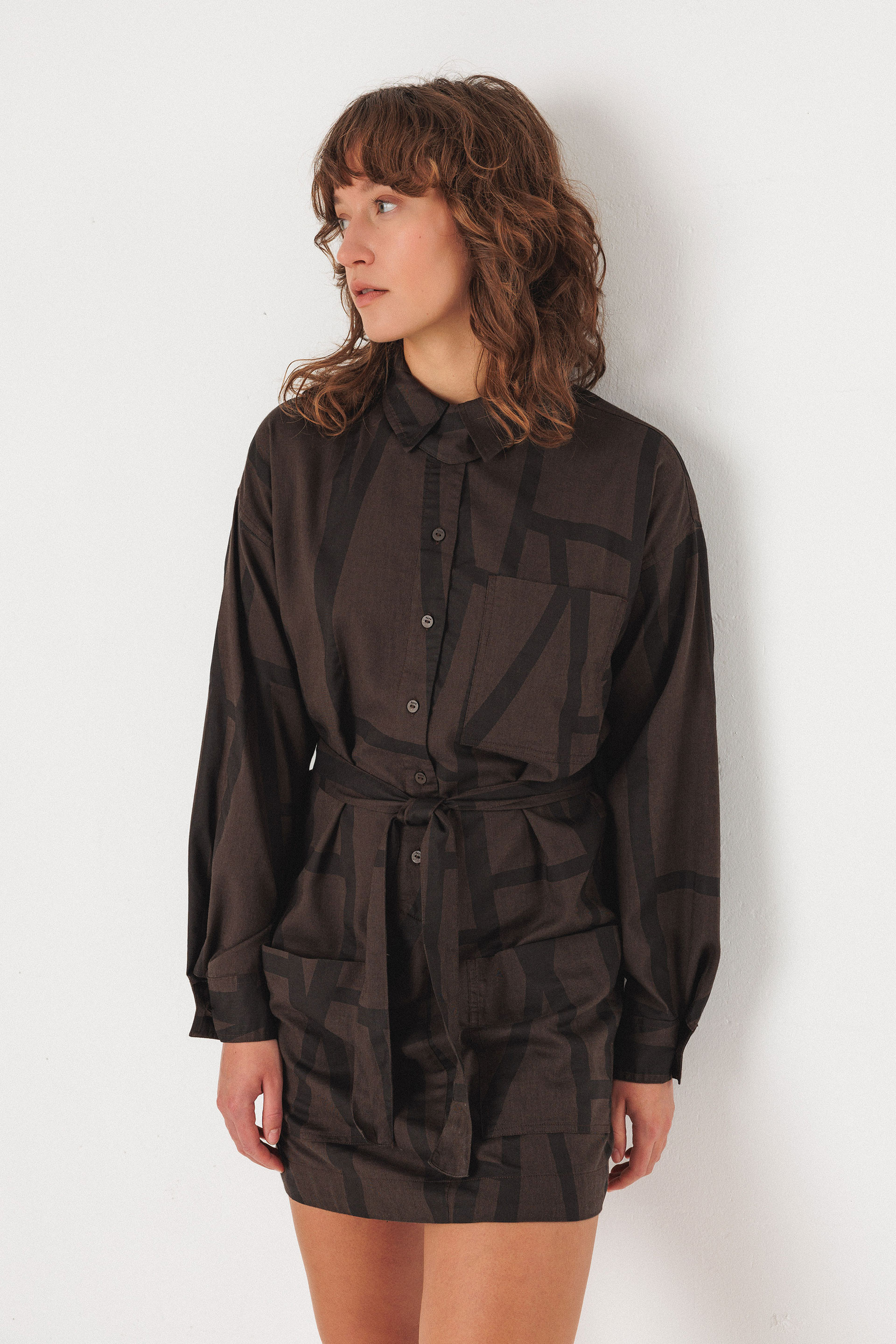 Vestido camisero corto con cierre delantero abotonado y cuello clásico, que se completa con una lengüeta de sujeción. Este modelo lleva un cinturón extraíble.