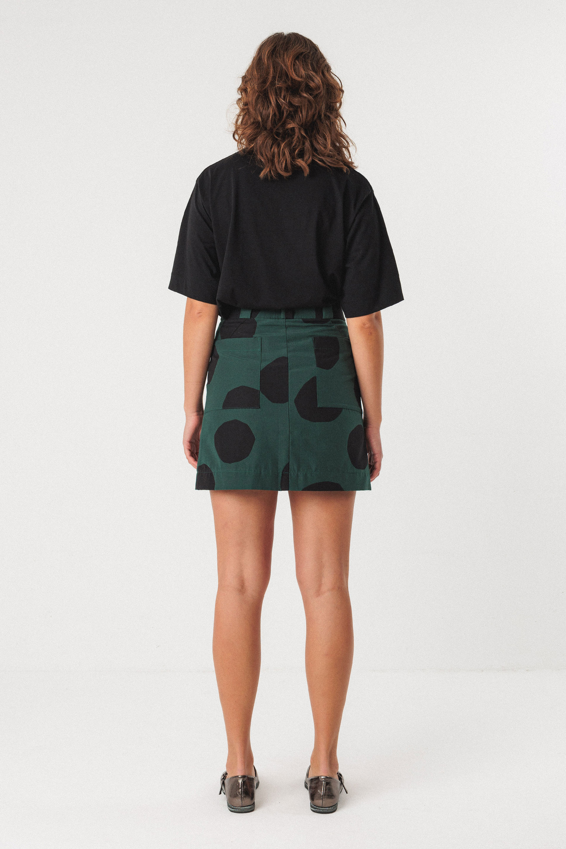 Falda acampanada de tejido jacquard de corte por encima de la rodilla. Cierre de cremallera y botón delantero.