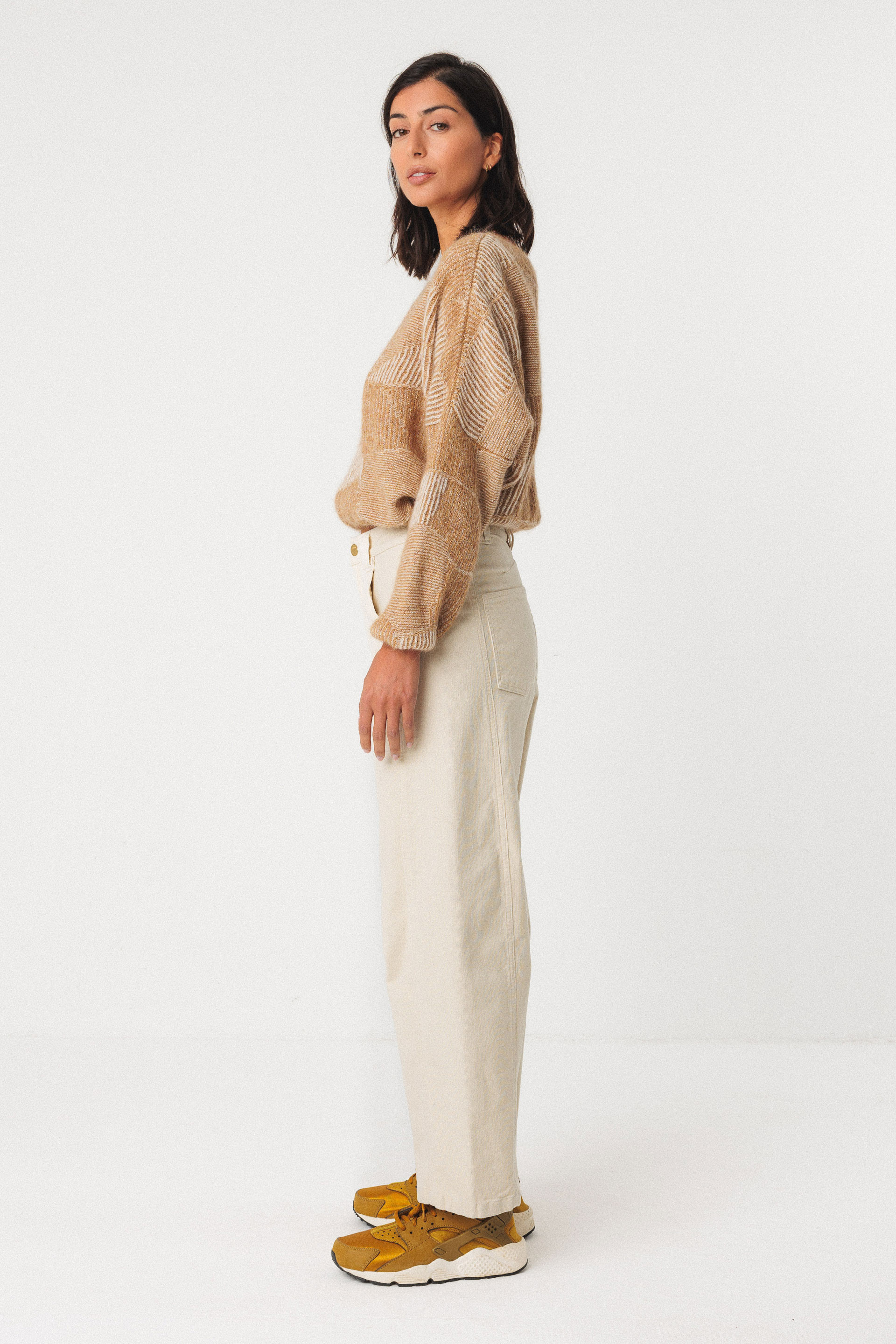 Suéter de alpaca reciclada mezclada hecho en Portugal. Es un modelo corto de manga larga hecho de punto semigrueso y con el cuello barco.