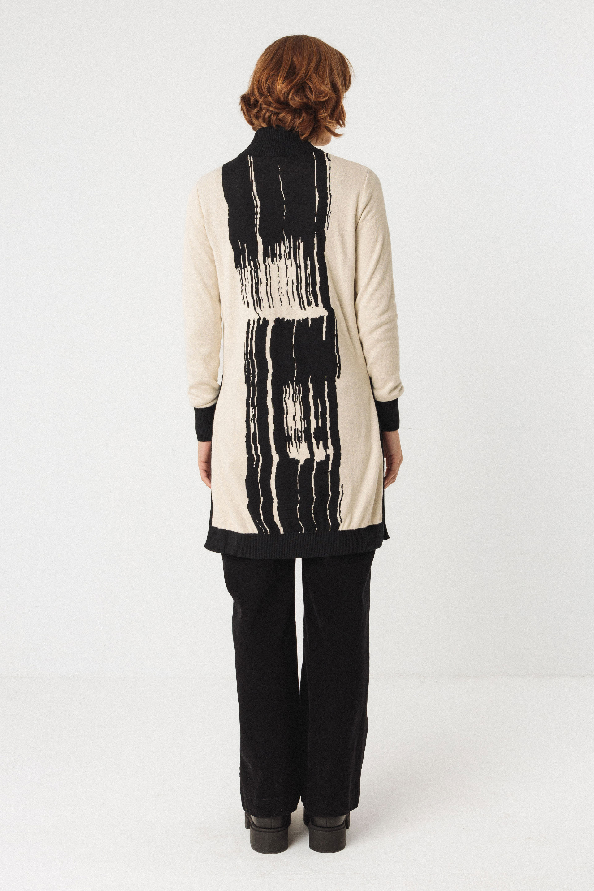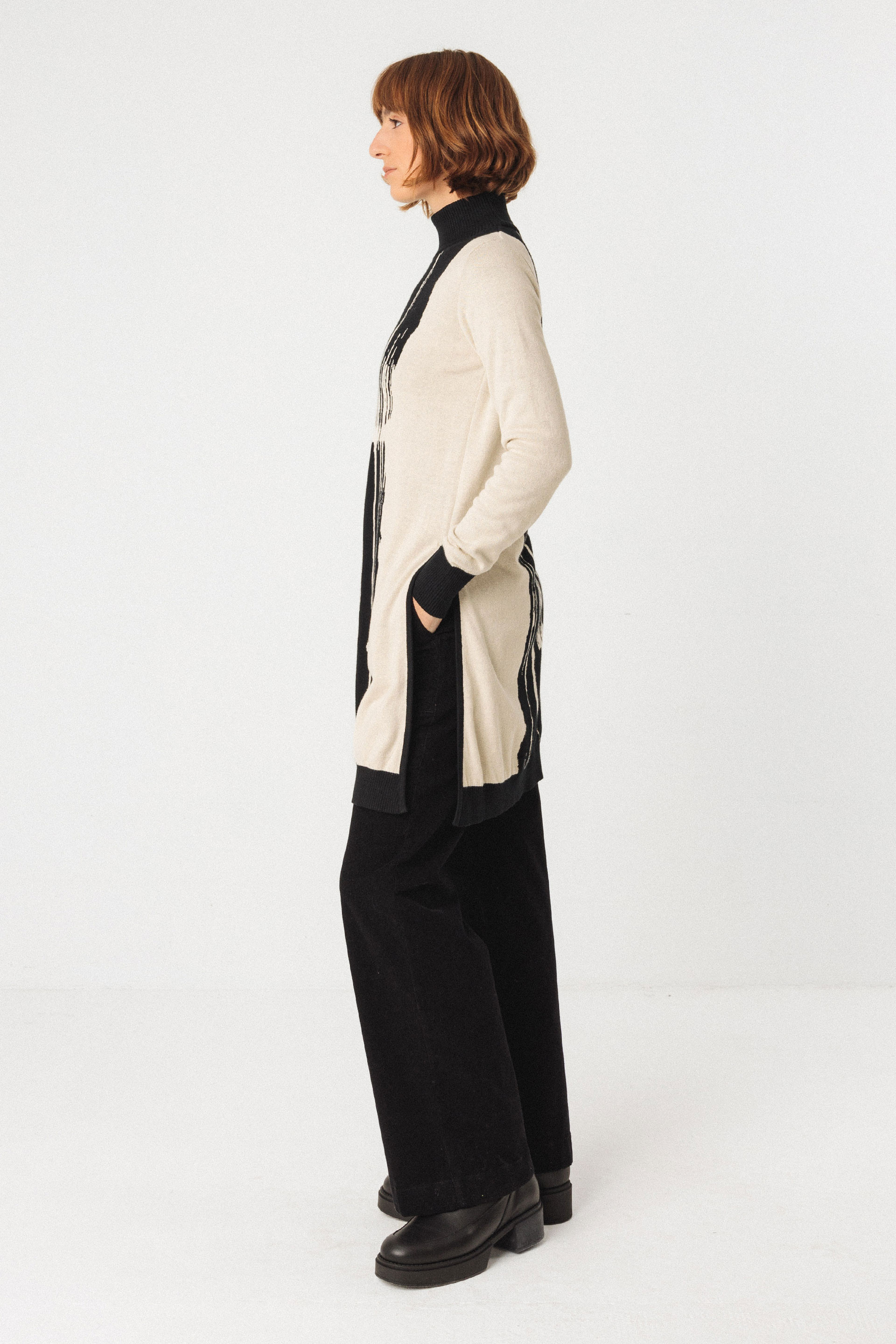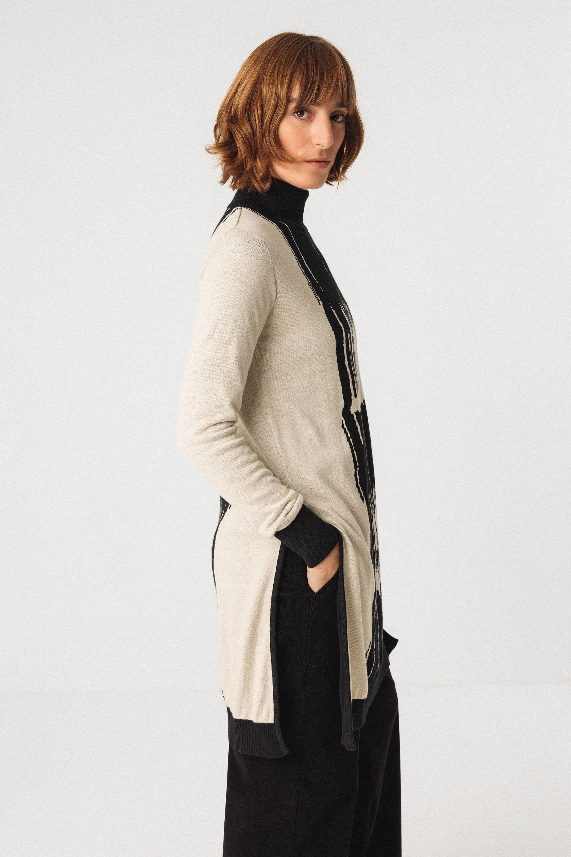 Suéter largo de punto fino con un dibujo jacquard estructurado y cuello alto. Llega por encima de la rodilla y tiene unas aberturas largas en los laterales.
