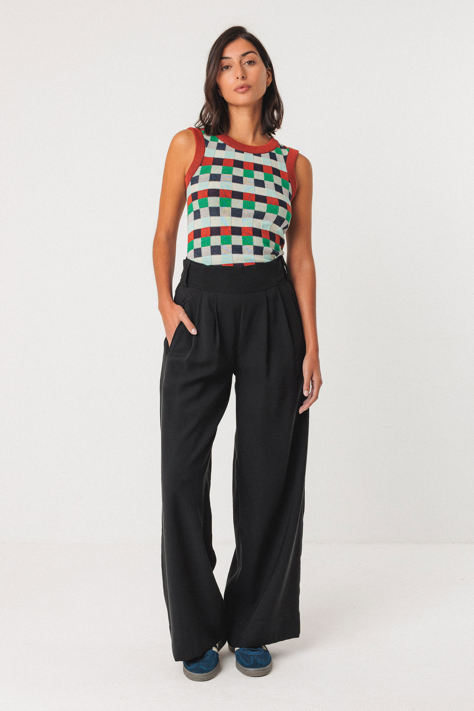 Pantalón palazzo de cintura alta con unas franjas de adorno con botones en la cintura. Llega hasta el tobillo y tiene bolsillos delanteros y un cierre de cremallera lateral.