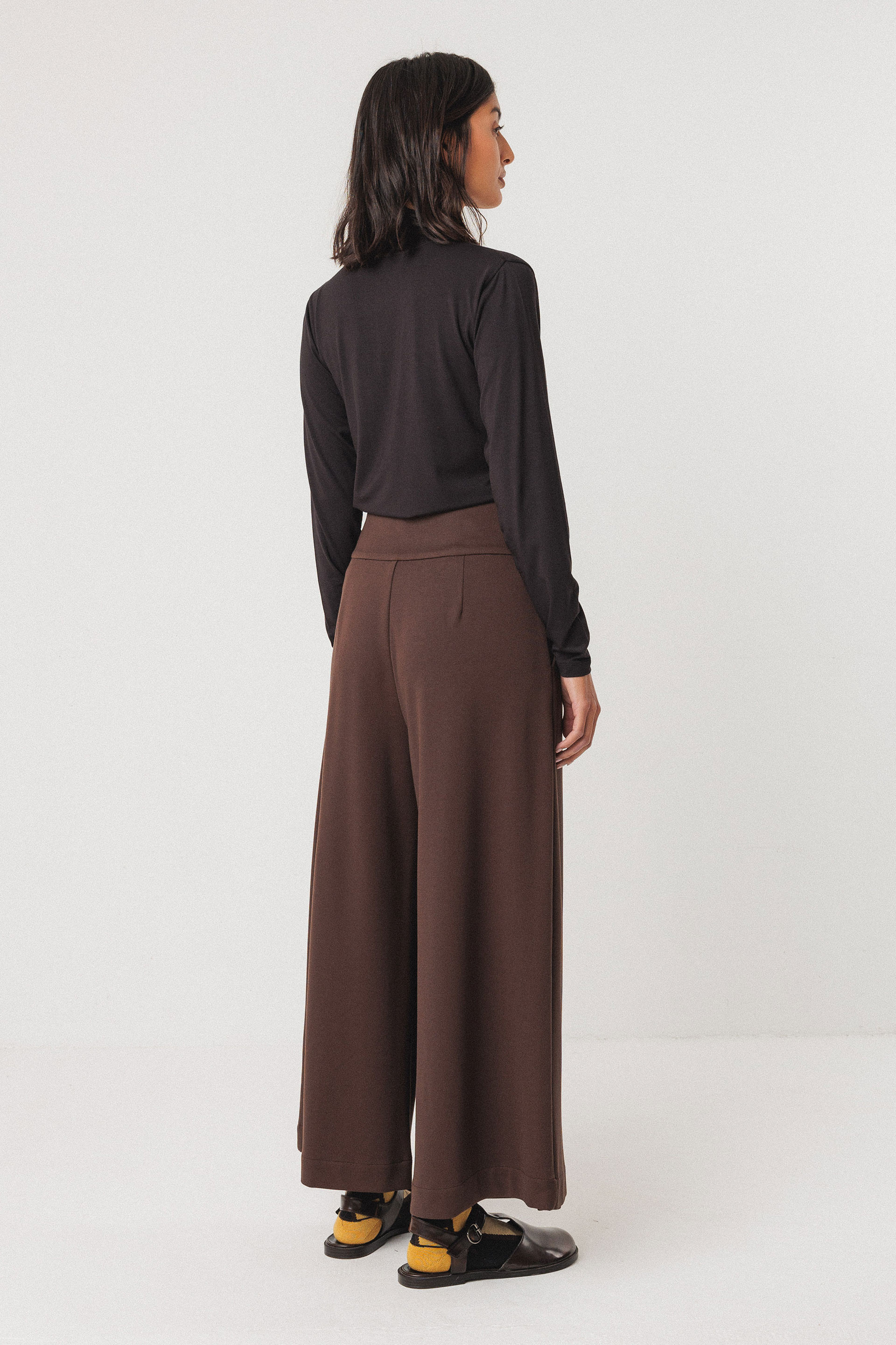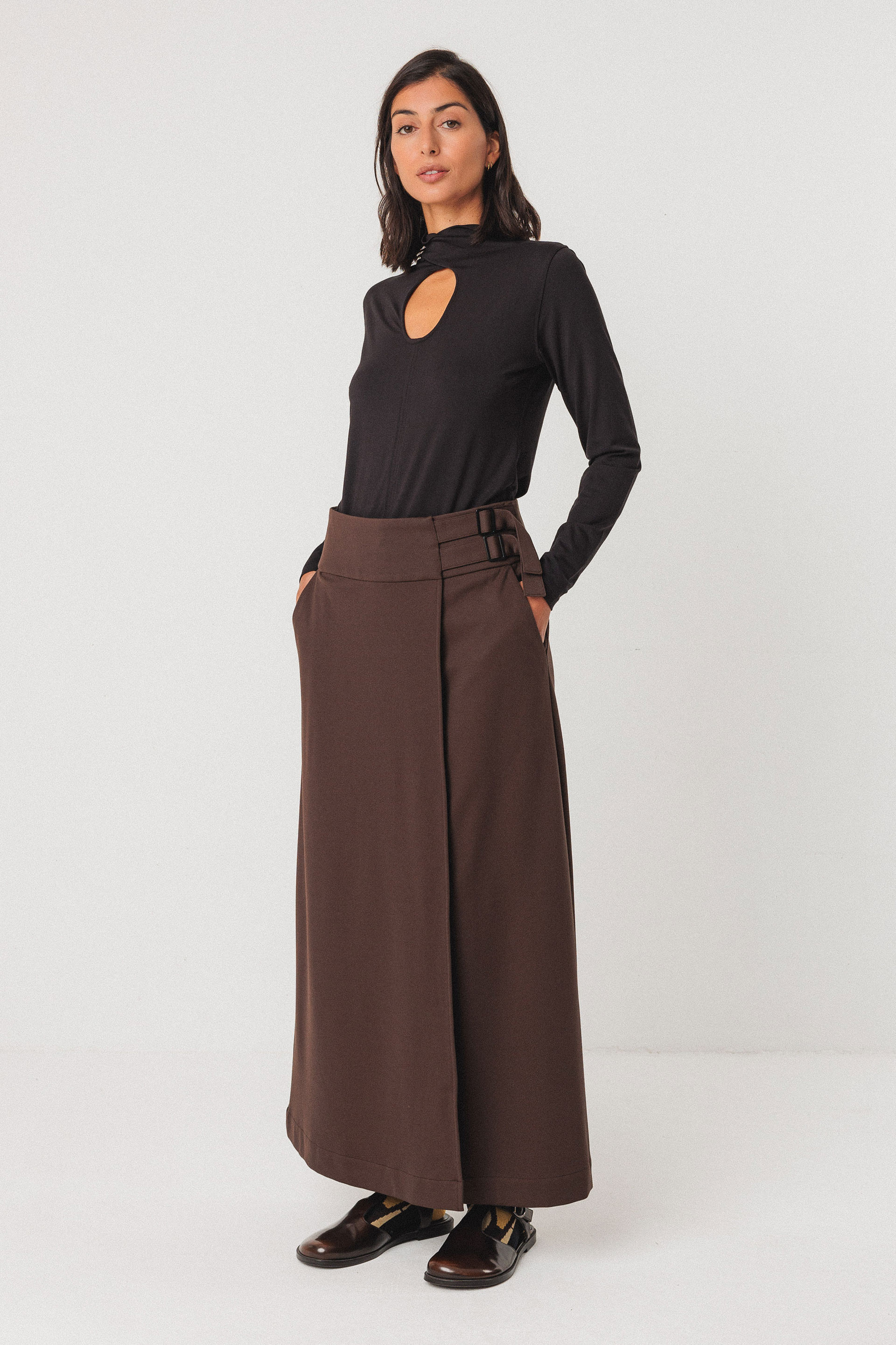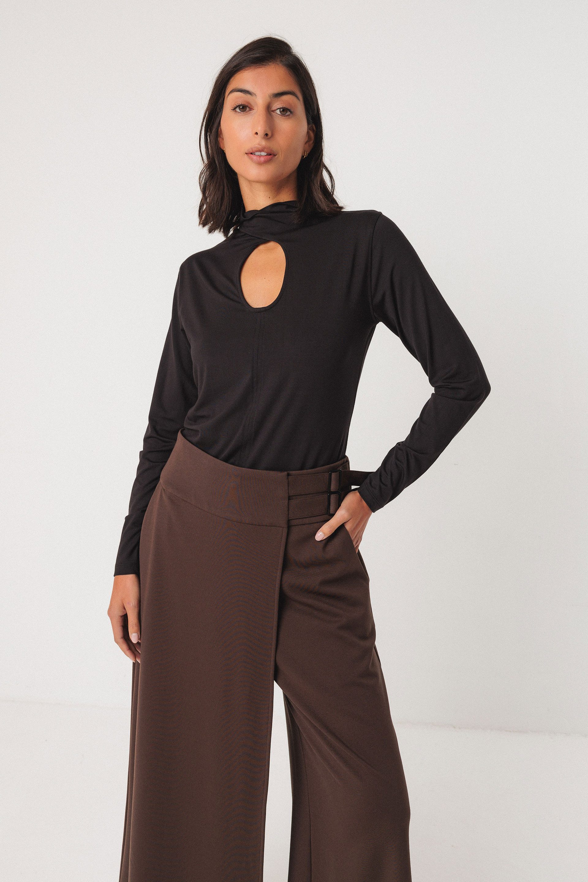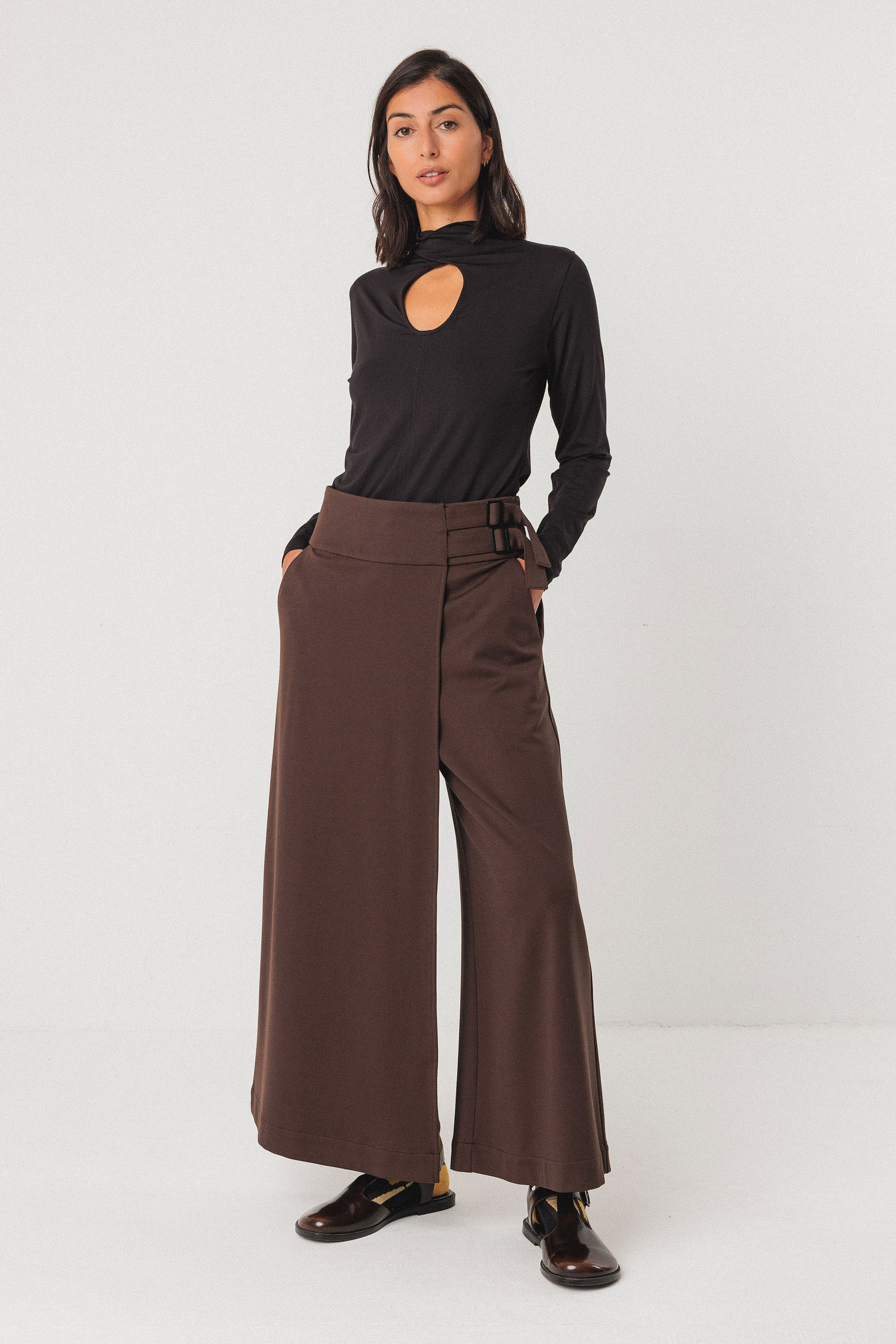 Pantalón drapeado de pata ancha de estilo falda-pantalón hasta el tobillo. El pantalón se cierra con una cremallera delantera, mientras que la parte drapeada se sujeta con dos hebillas rectangulares. Modelo con bolsillos a los lados.