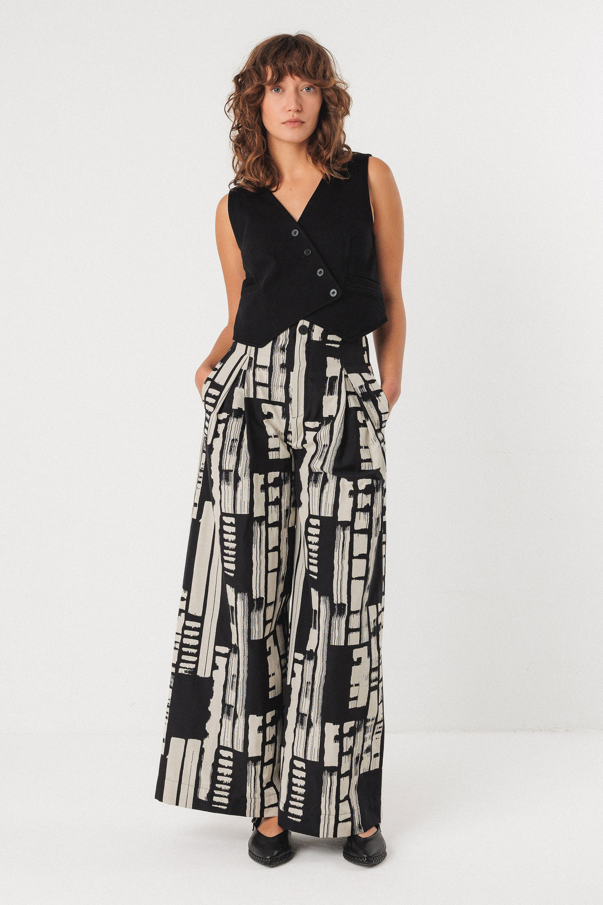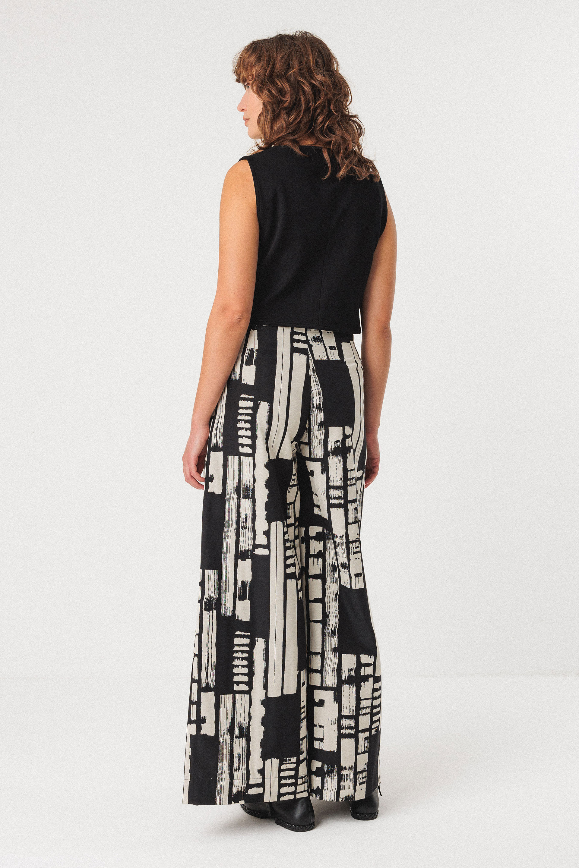Pantalón palazzo de talle alto confeccionado con tejido jacquard de algodón orgánico y poliéster reciclado. Cierre delantero de cremallera y bolsillos en los laterales.