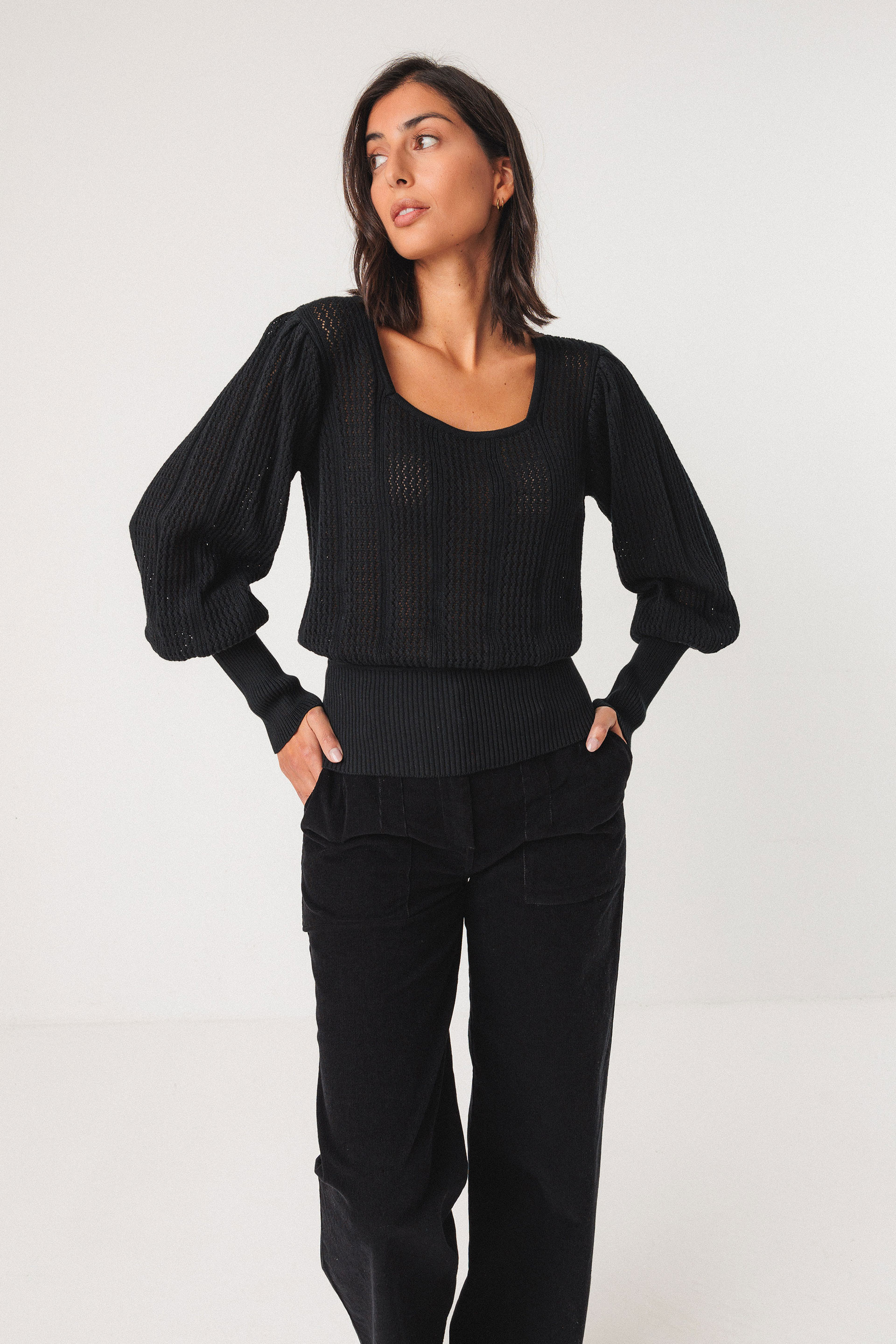 Camiseta fina de punto con efecto texturizado. Tiene el escote cuadrado y las mangas largas abullonadas con los puños de canalé.