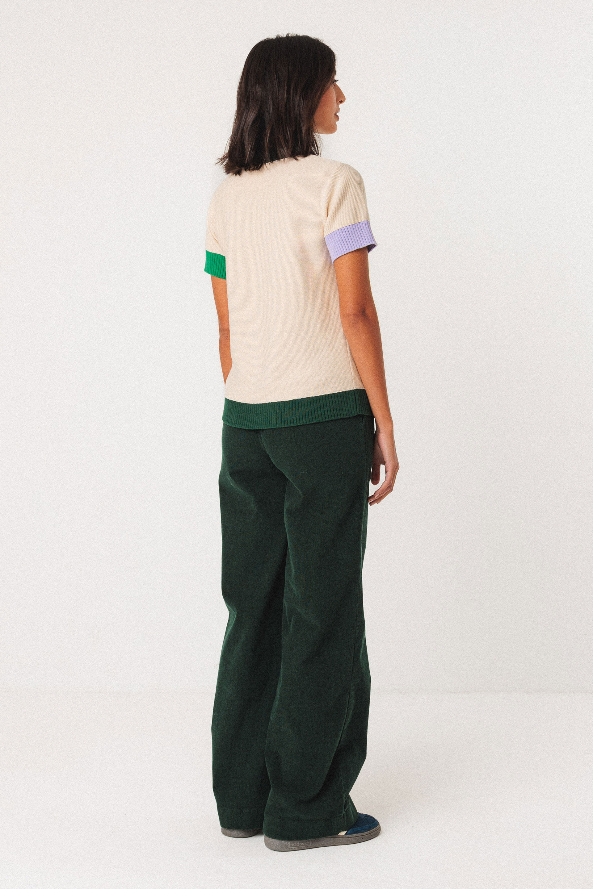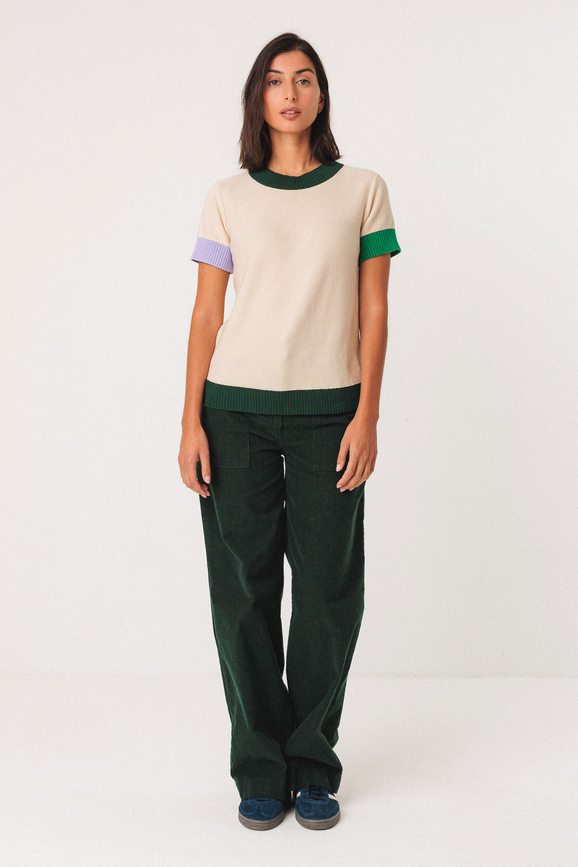 Camiseta fina de punto de algodón orgánico con certificado GOTS. Tiene el corte recto, cuello redondo, es de manga corta y lleva unos remates de canalé en contraste en el cuello, las mangas y la cintura.