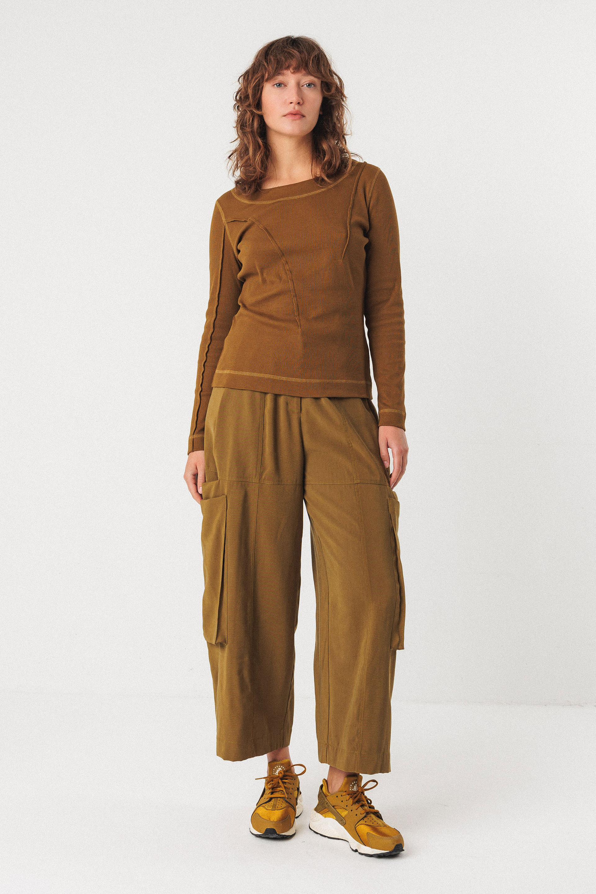 Camiseta de manga larga y cuello redondo adornada con pliegues ribeteados.