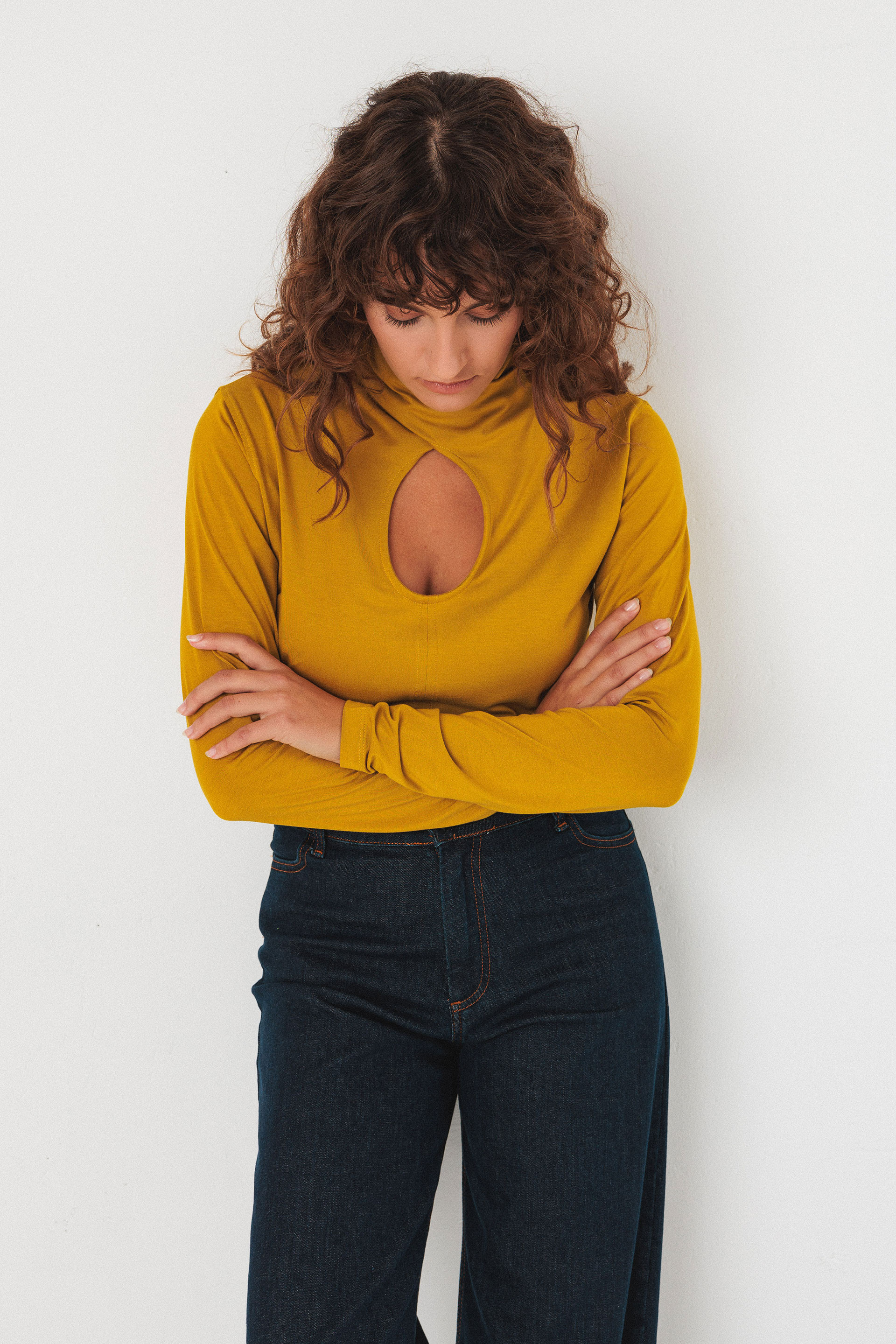 Camiseta de manga larga y cuello alto con efecto drapeado y una abertura de adorno delante. Corte ceñido.