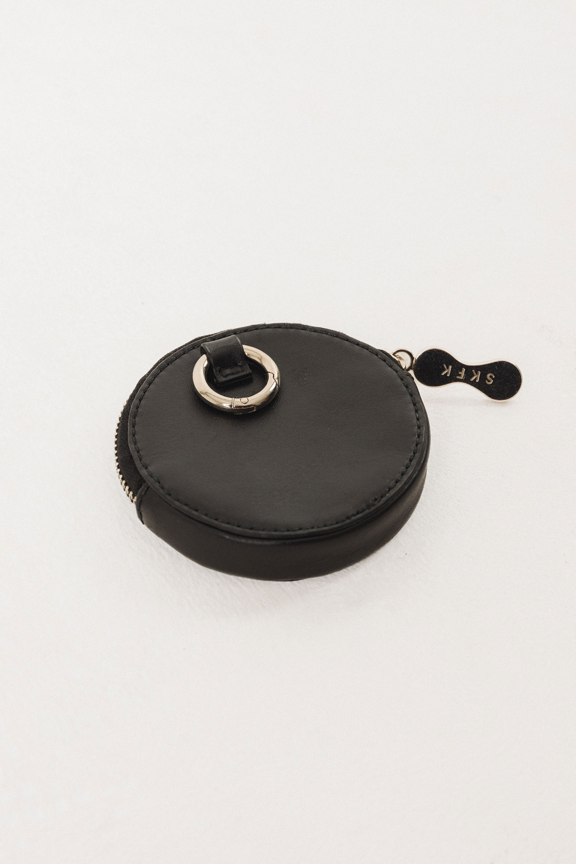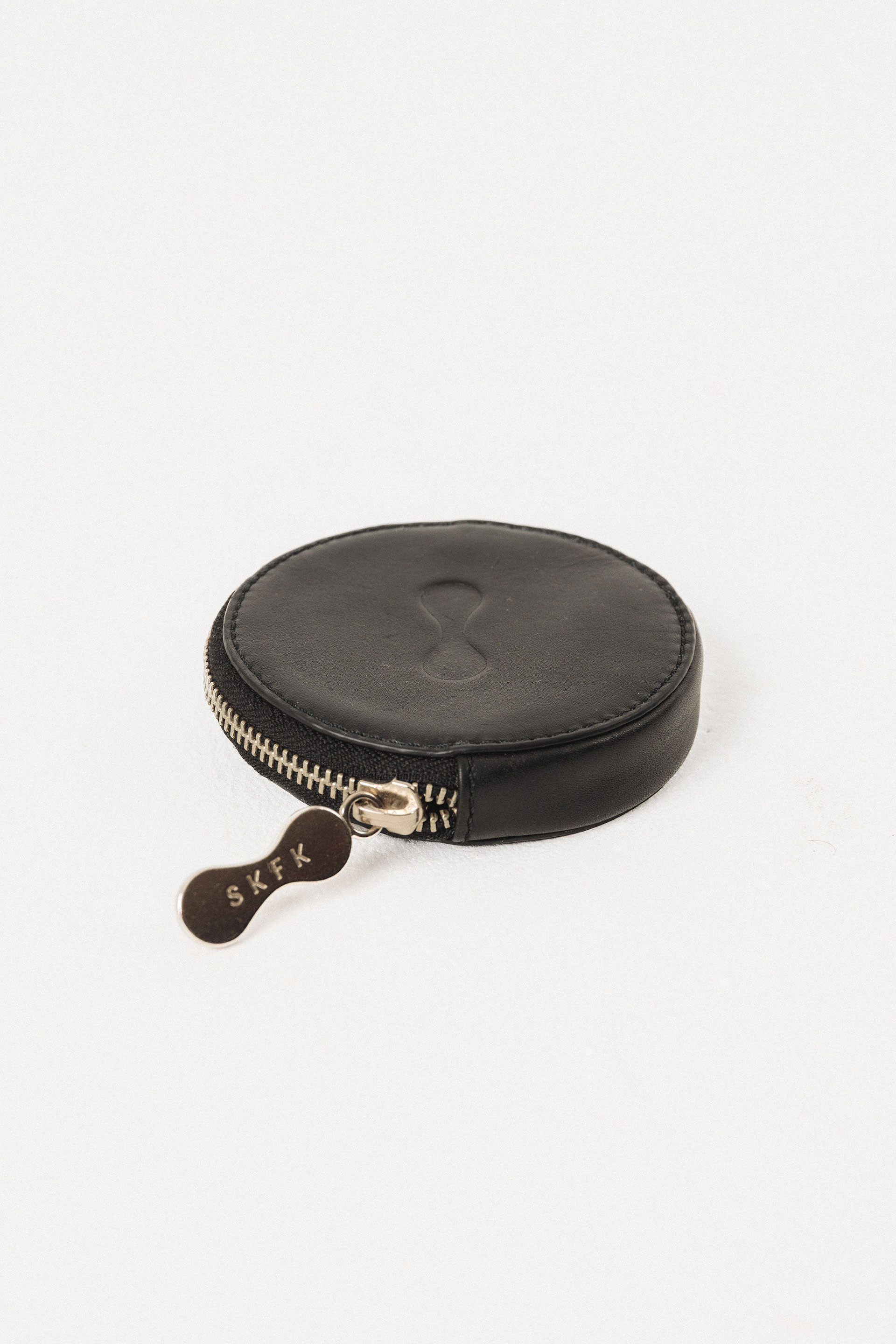 Monedero redondo con cierre de cremallera y forro de algodón. 9.5 x 9.5 cm.