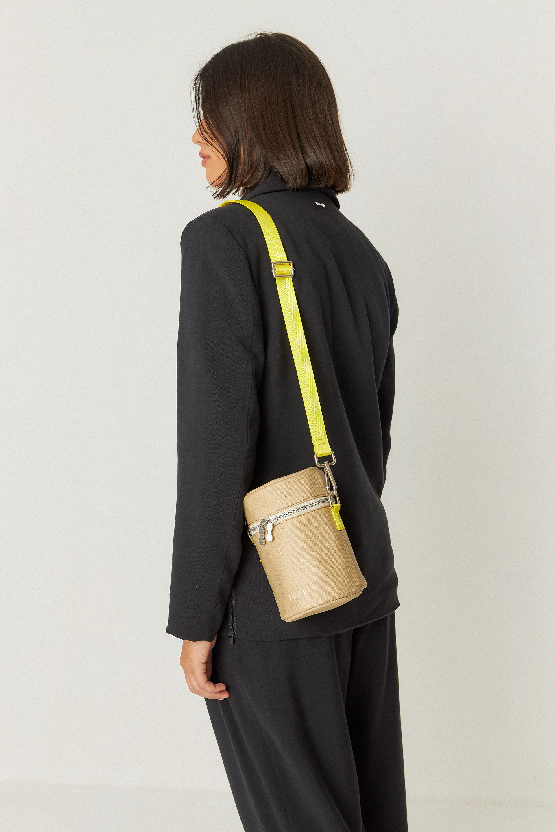 Minibolso acolchado de forma cilíndrica con cierre de cremallera, correa ajustable y bolsillos interiores. Mide 12 x 18 x 12 cm.