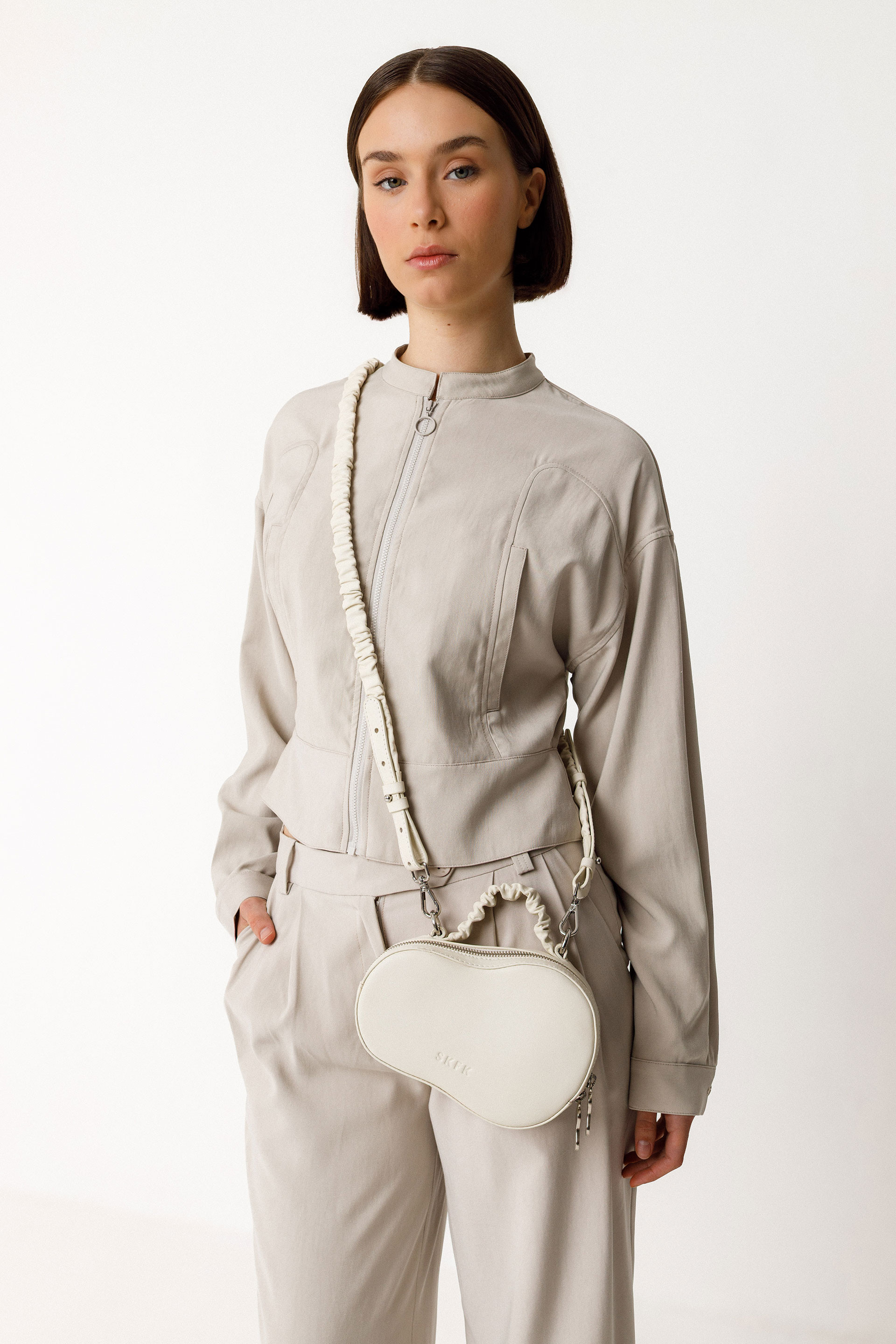 Bolso de piel estructurado con forma orgánica. Tiene asas y cierre de cremallera. Forro de algodón y bolsillo interior de cremallera. Mide 20 x 14 cm.