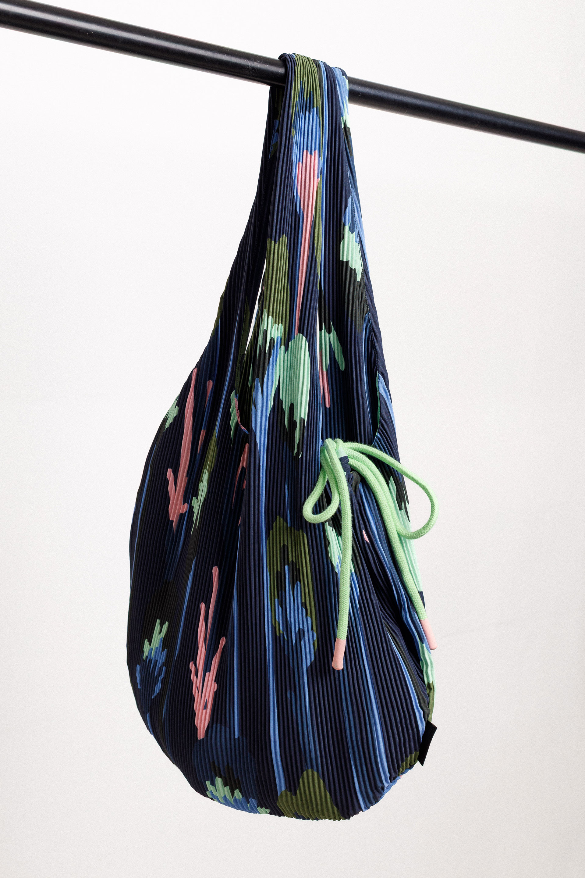 Tote bag de tela plisada estampada con dos asas. Mide 40 x 66 cm.