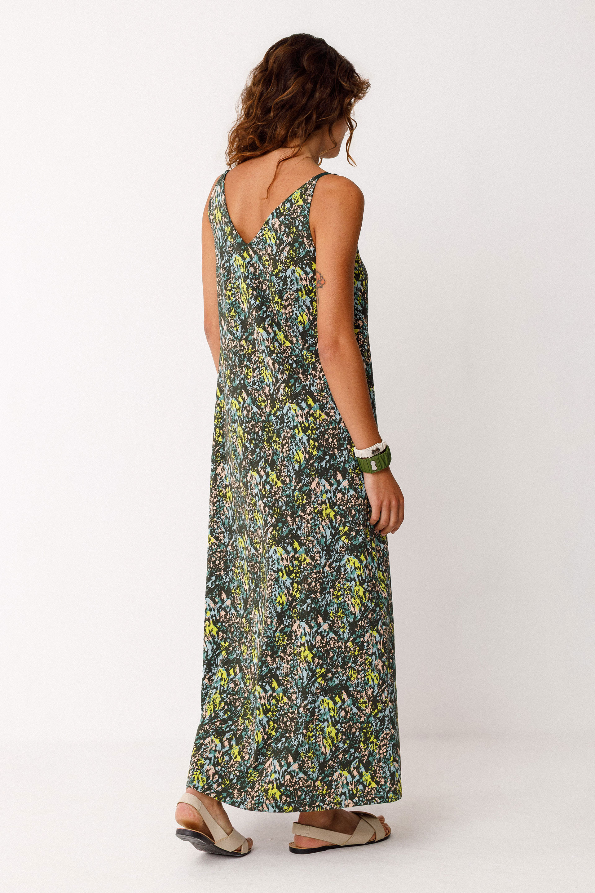 Vestido midi de tirantes de corte acampanado y cuello de pico. Hecho de algodón orgánico con certificado GOTS.