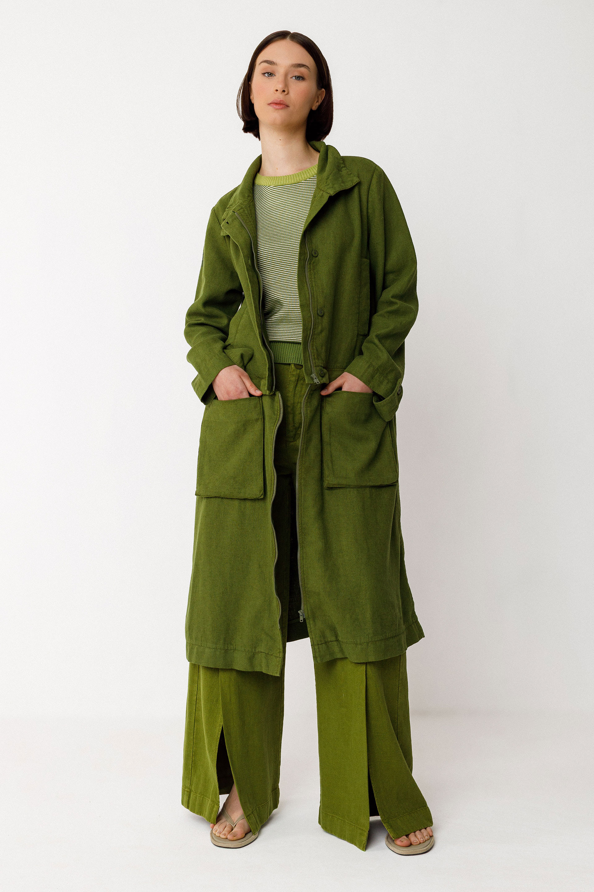 Gabardina dos en uno con la parte de abajo desmontable. De corte recto por debajo de la rodilla y con el cuello alto. Lleva el cierre delantero de cremallera, bolsillos ribeteados en la parte de arriba y bolsillos de parche en la de abajo.