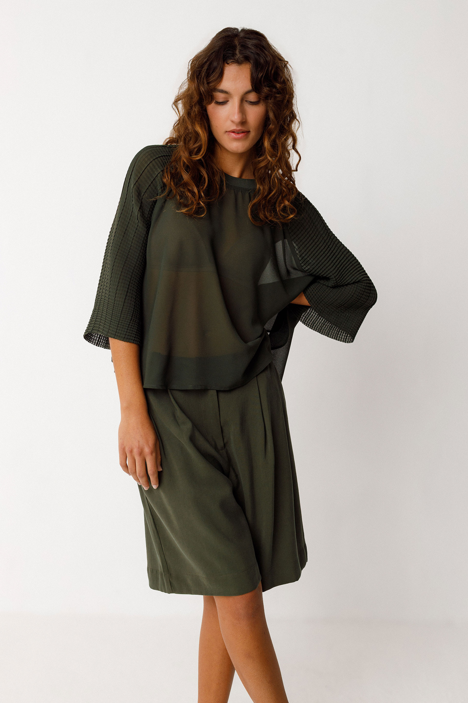 Camisa de forma semicircular con el cuello redondo de canalé y las mangas 3/4 en un tejido en contraste.