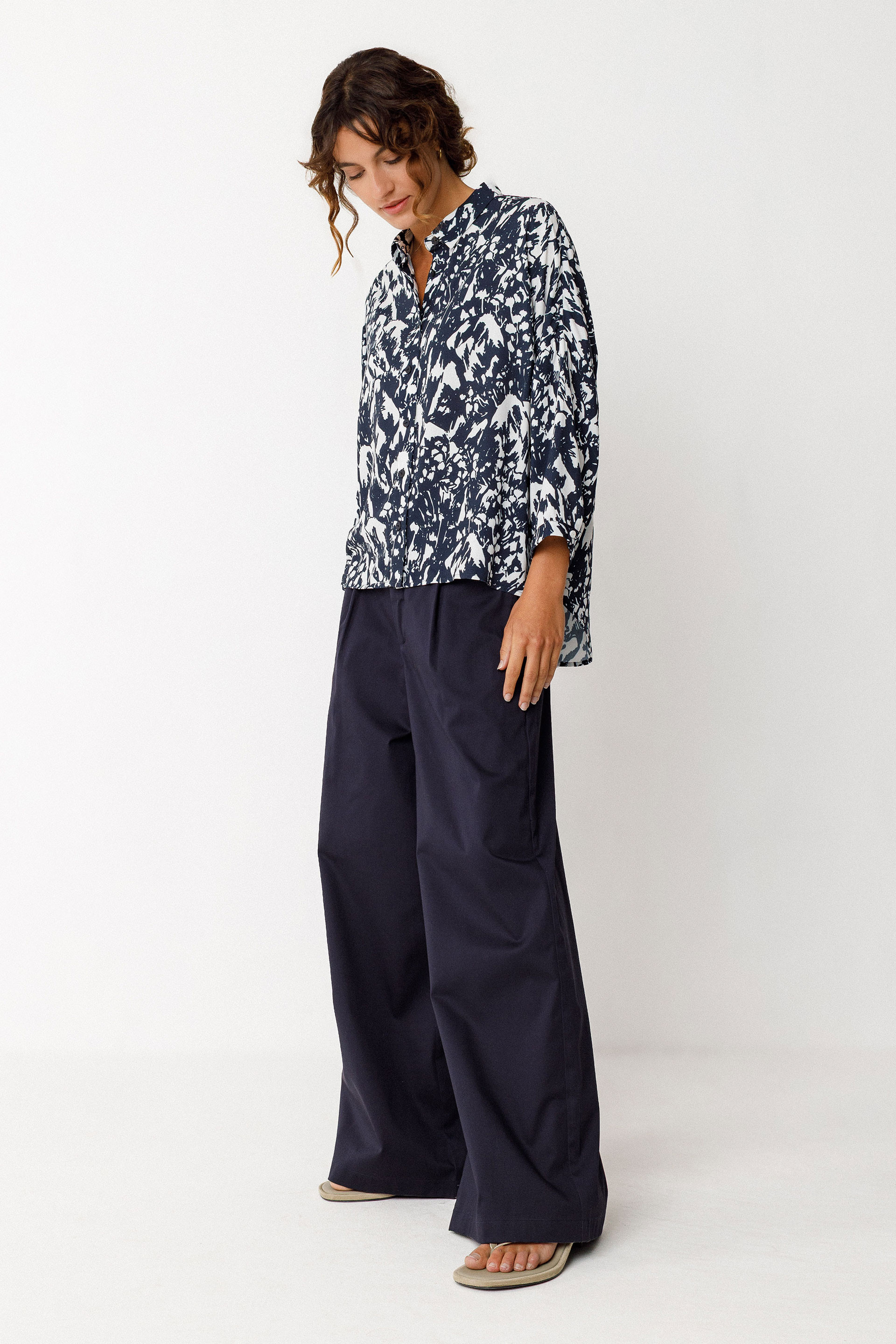 Camisa de manga 3/4 con cierre delantero abotonado. Corte más largo por detrás y puños abotonados.