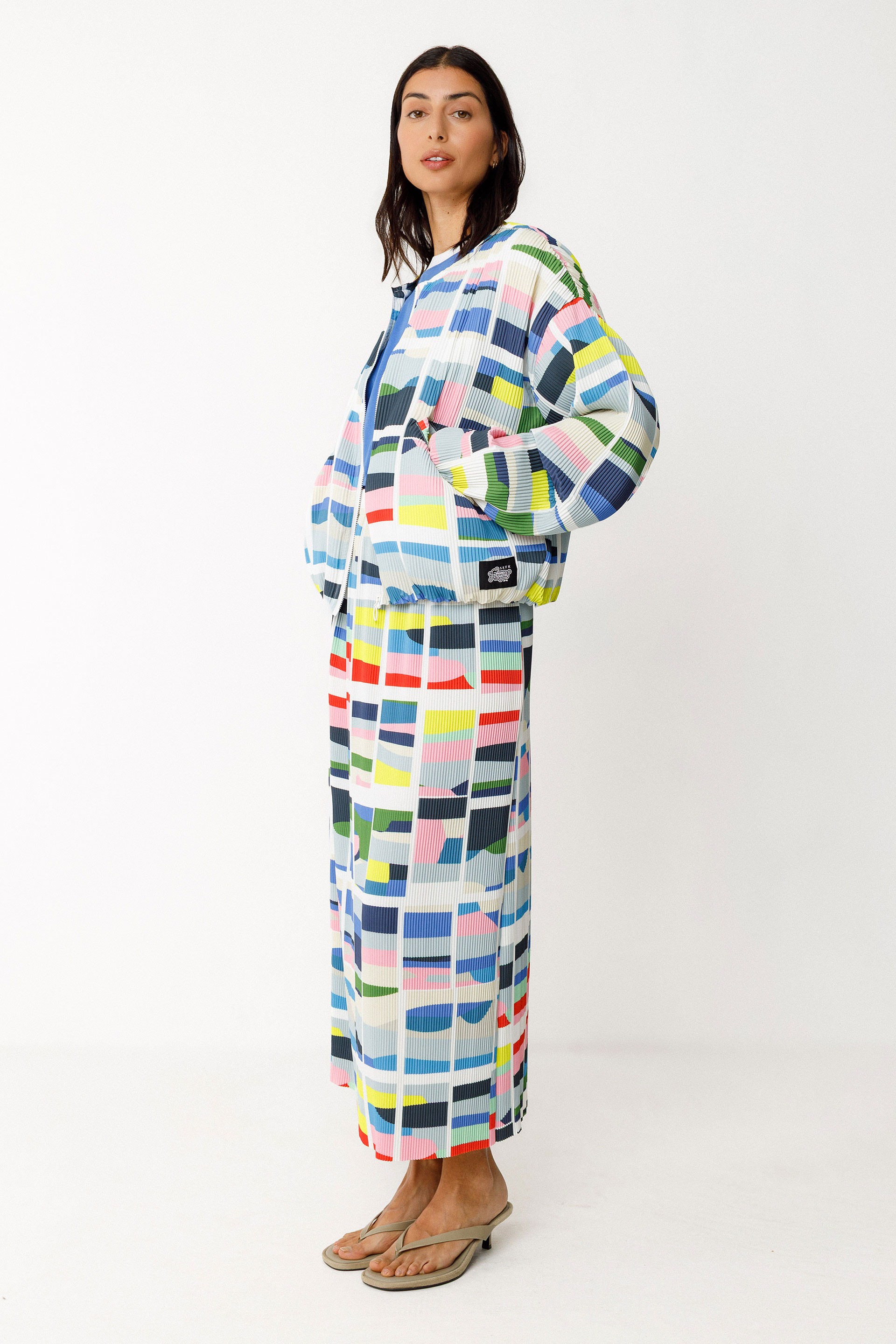 Falda midi acampanada de tela plisada, fruto de la colaboración con el artista Grems. Cintura elástica para ponérsela fácilmente.