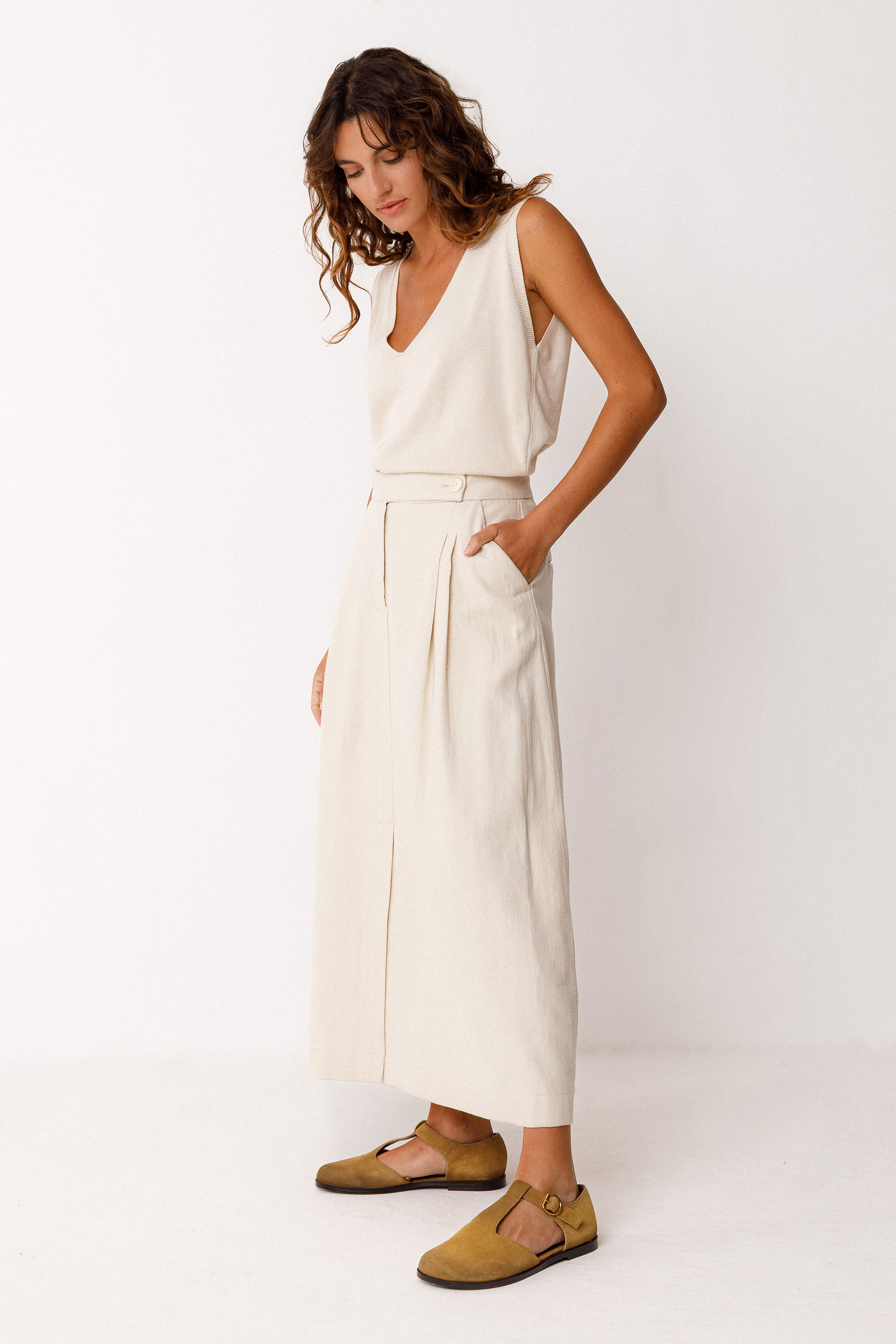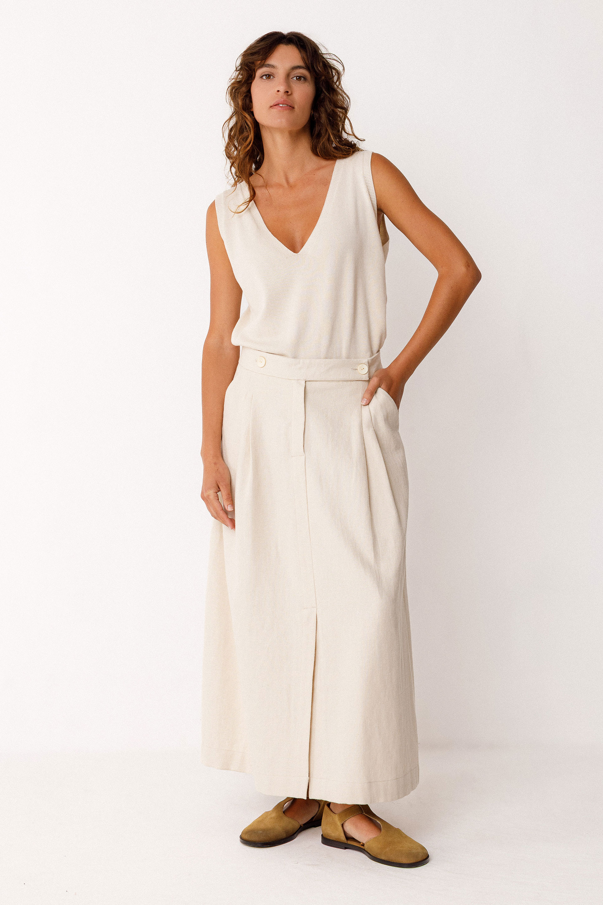 Falda midi de forma acampanada con bragueta de cremallera delantera. Tiene bolsillos laterales y una abertura en el centro de la parte delantera.