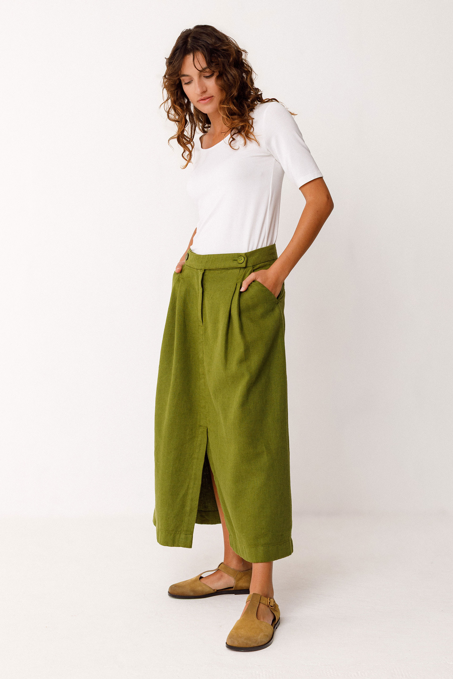 Falda midi de forma acampanada con bragueta de cremallera delantera. Tiene bolsillos laterales y una abertura en el centro de la parte delantera.