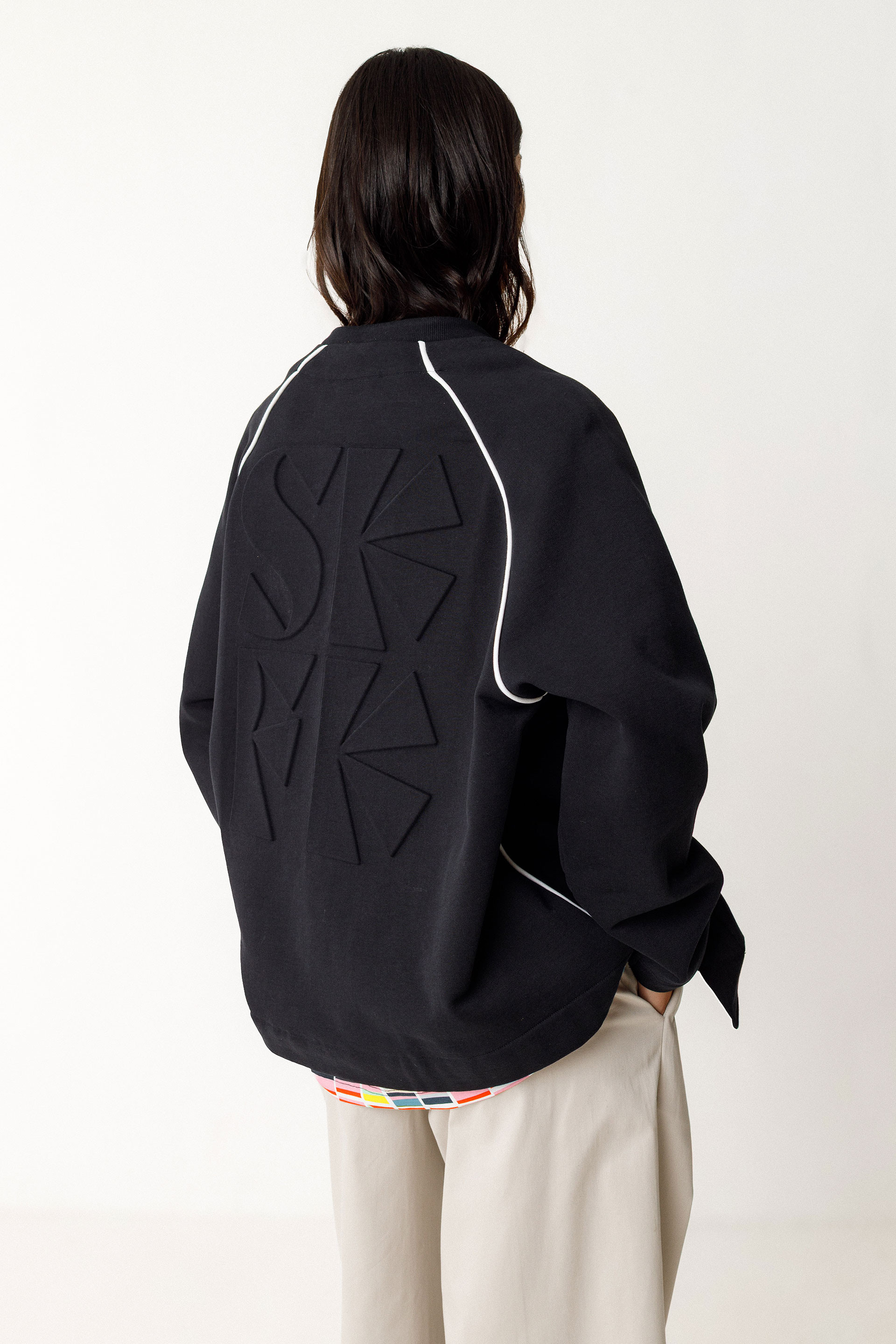 Sudadera oversize de algodón orgánico con certificado GOTS. Tiene el cuello bomber y un cierre delantero central de cremallera y está adornada con pespuntes en contraste.