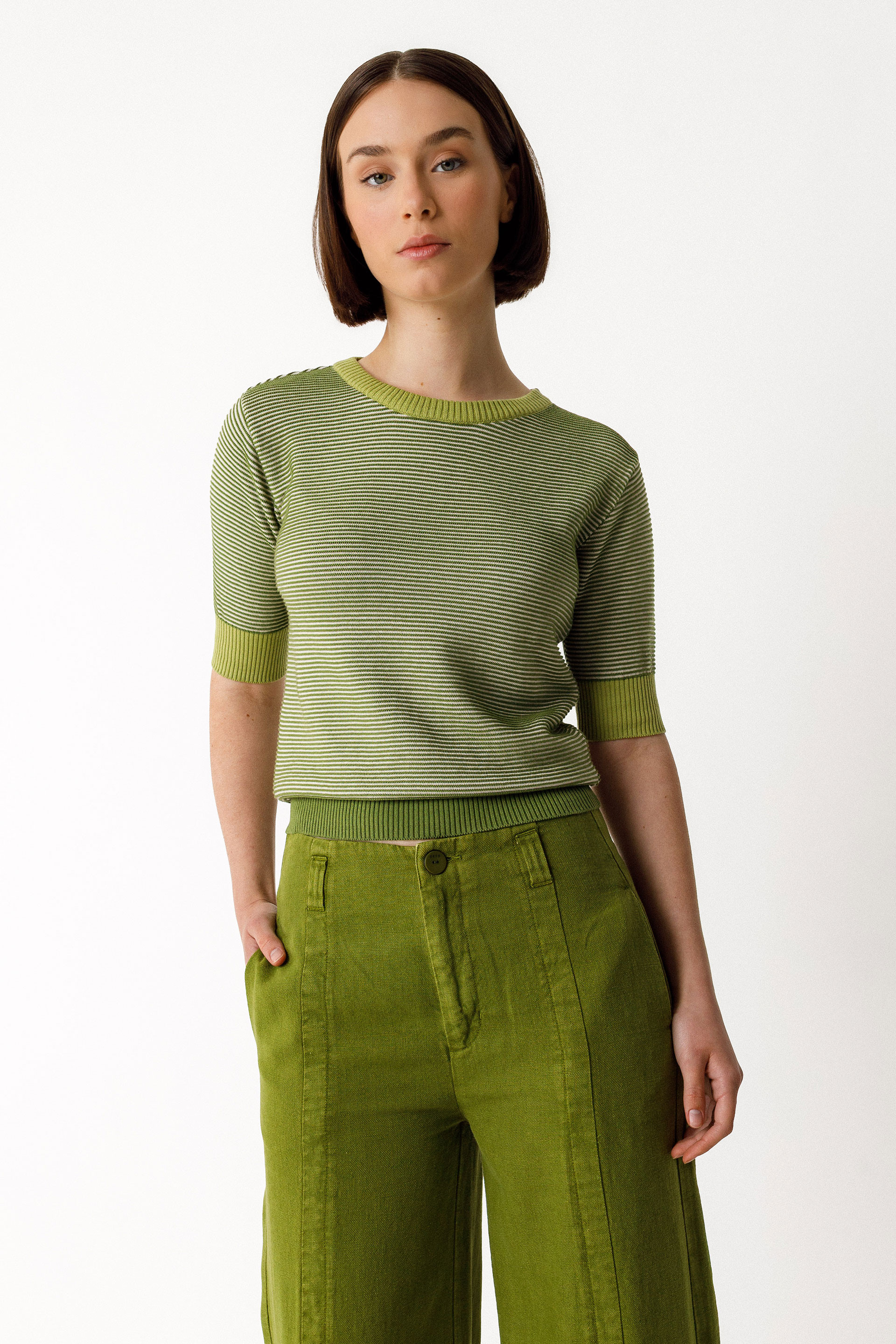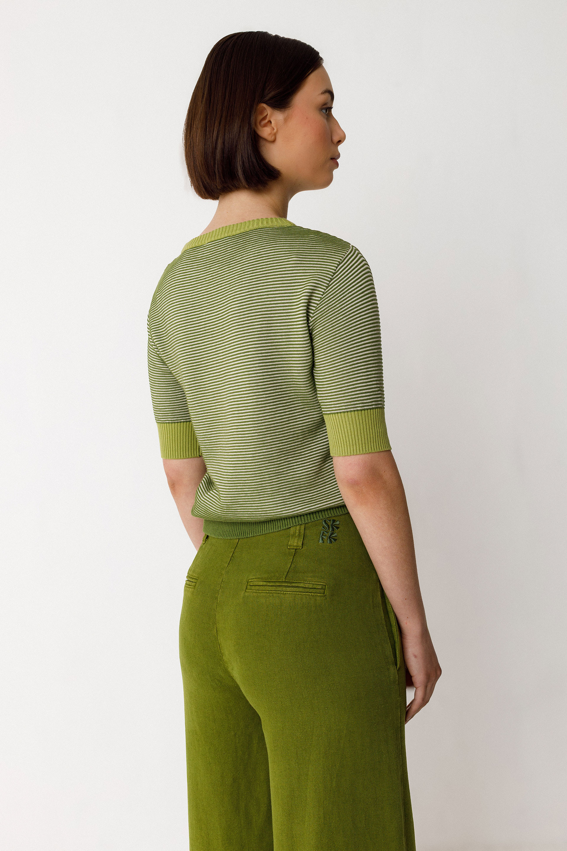 Suéter bicolor con efecto texturizado hecho de punto ligero de algodón orgánico con certificado GOTS. Tiene el cuello redondo, las mangas 3/4 y unos remates de canalé en el cuello, los puños de las mangas y la cintura.