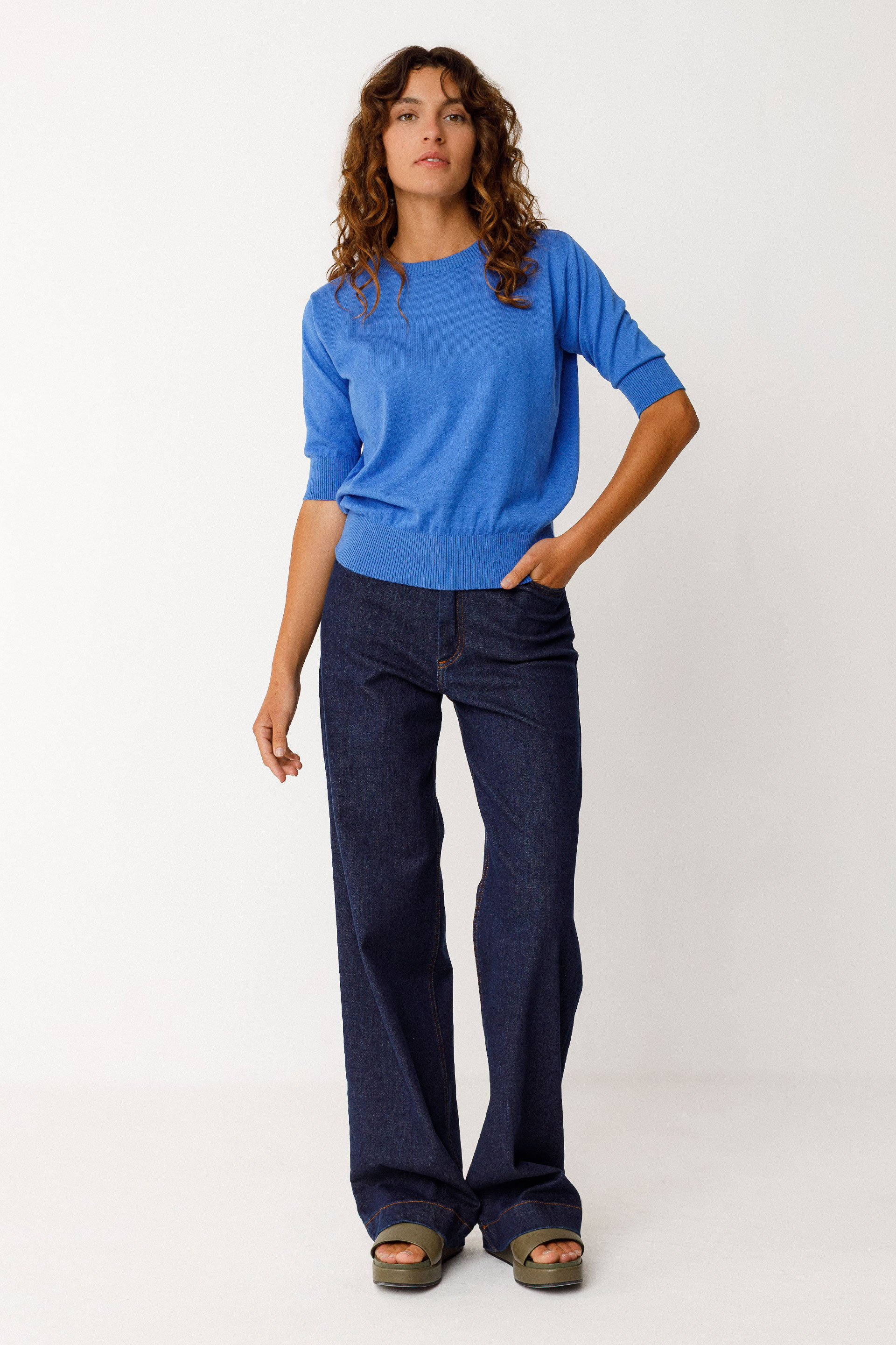 Suéter bicolor con efecto texturizado hecho de punto ligero de algodón orgánico con certificado GOTS. Tiene el cuello redondo, las mangas 3/4 y unos remates de canalé en el cuello, los puños de las mangas y la cintura.