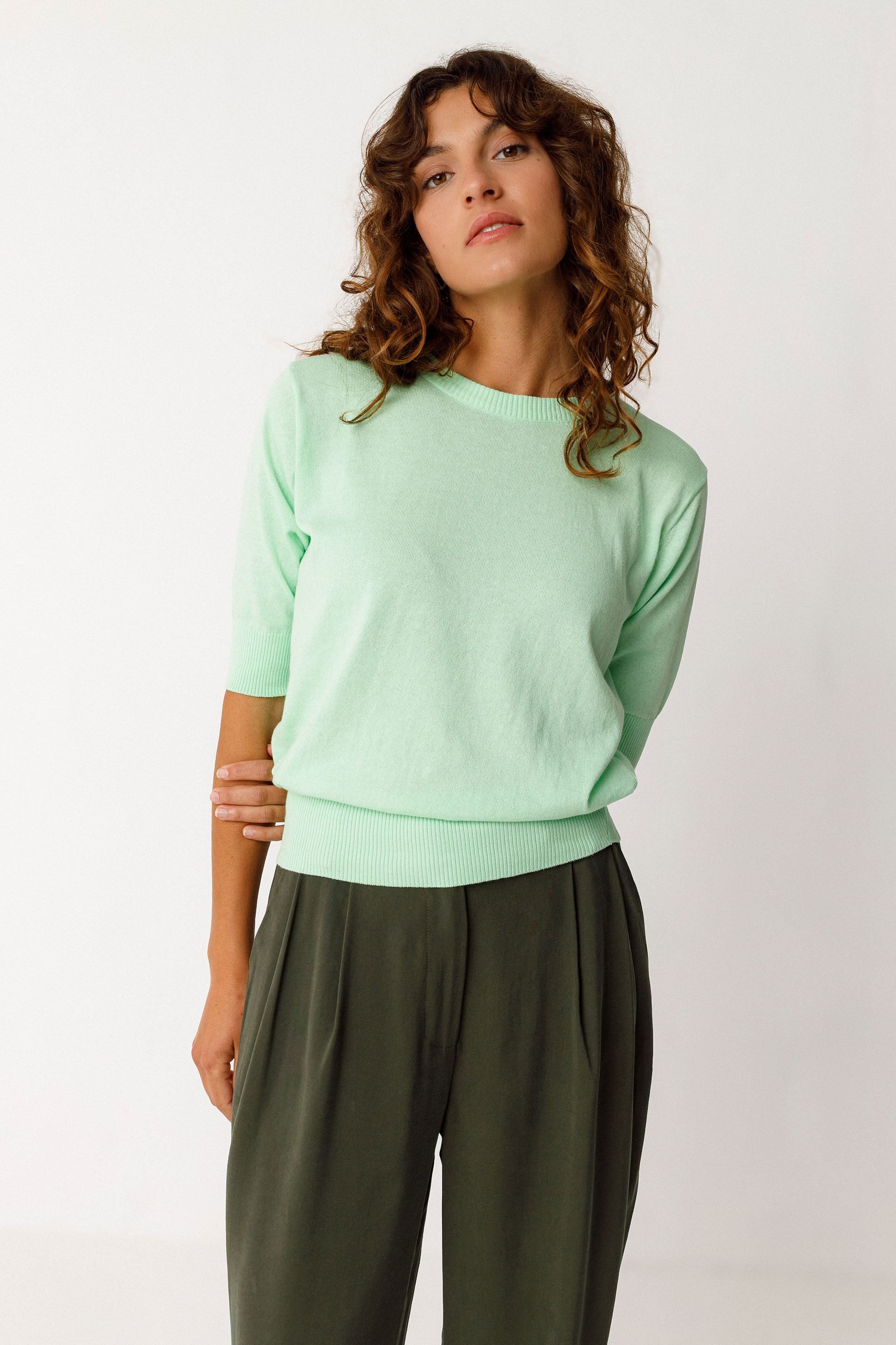 Suéter bicolor con efecto texturizado hecho de punto ligero de algodón orgánico con certificado GOTS. Tiene el cuello redondo, las mangas 3/4 y unos remates de canalé en el cuello, los puños de las mangas y la cintura.