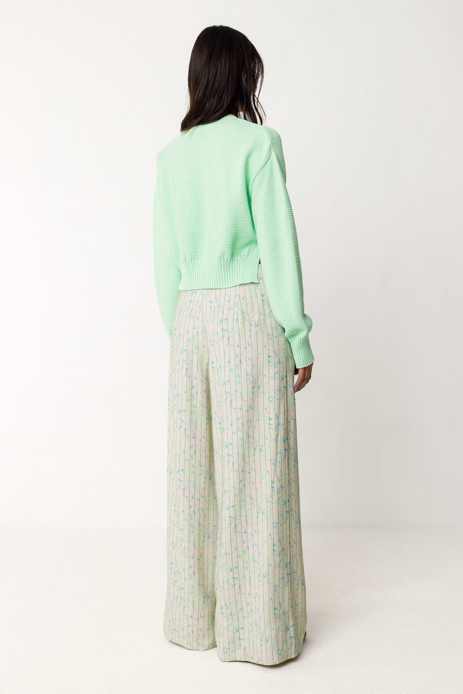 Pantalón palazzo de talle alto de lino y algodón orgánico. Bajos de las perneras con una abertura delantera, bragueta de cremallera frontal y bolsillos laterales. Largo total en una talla 38: 106 cm.