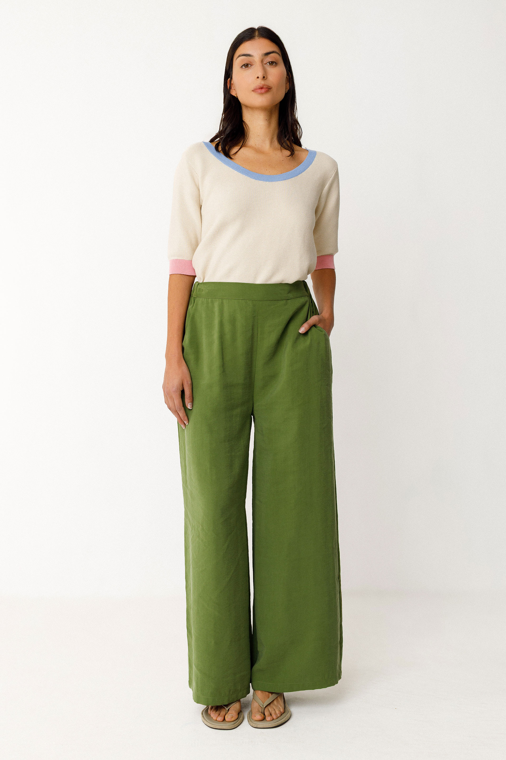 Pantalón palazzo fluido, con la cintura elástica por detrás y bolsillos laterales. Largo total en una talla 38: 107 cm.