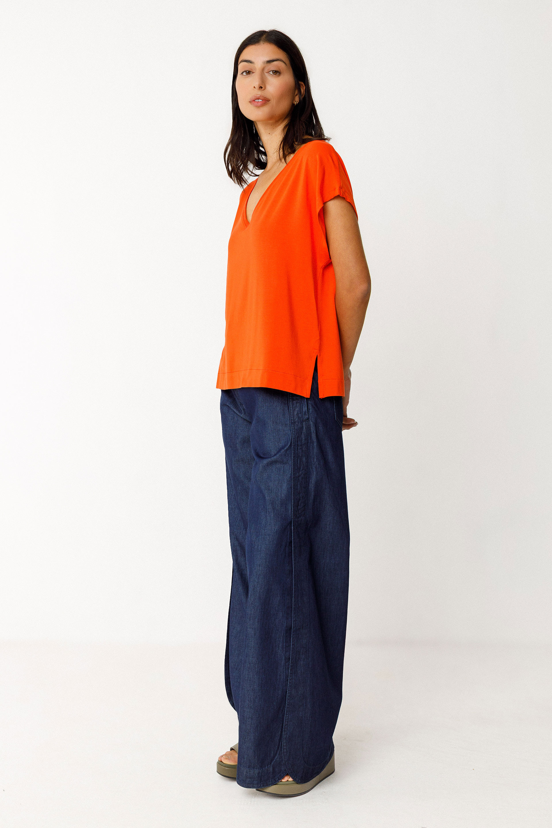 Camiseta holgada de hombros caídos con un pronunciado cuello de pico, adornada con un fino remate de canalé. Se completa con unas aberturas en los laterales. Color naranja.