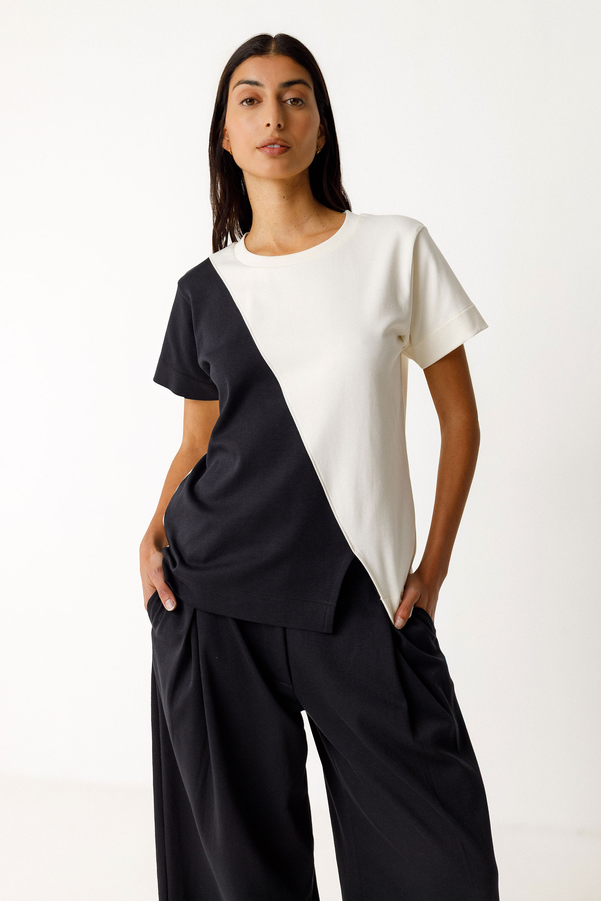 Camiseta de manga corta con efecto color block, de cuello redondo y corte recto.