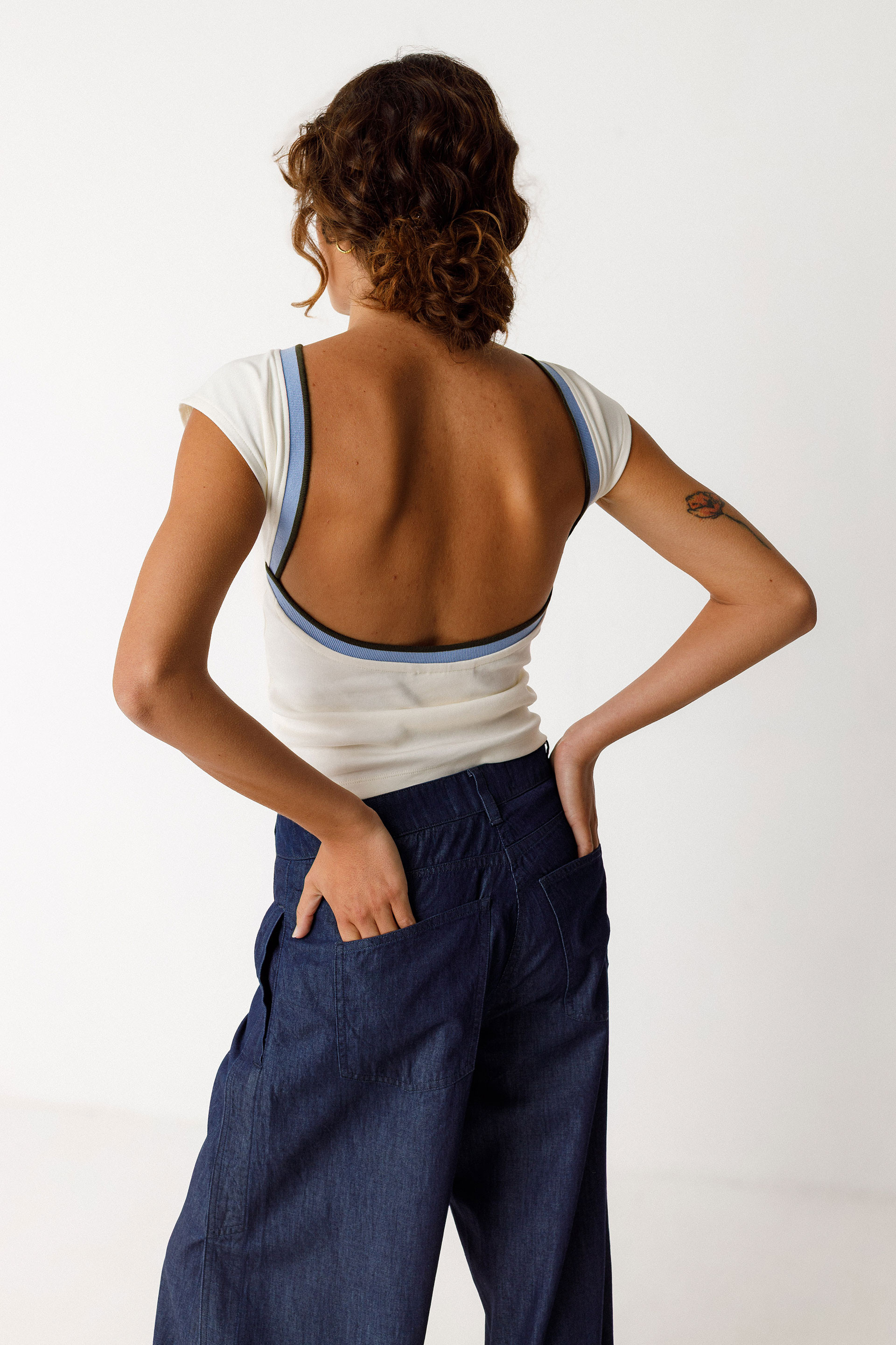 Camiseta sin mangas de corte ceñido y cuello barco con escote en la espalda.