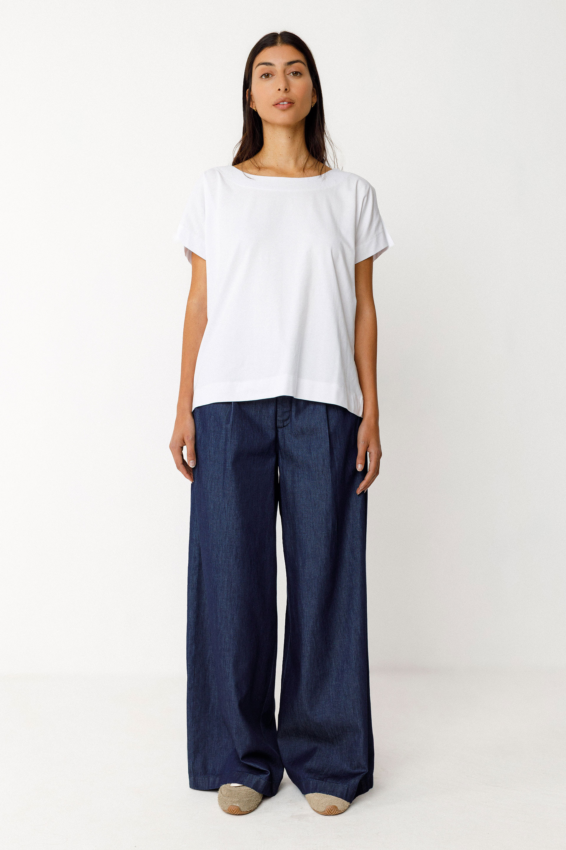 Camiseta de manga corta de escote redondo con una pequeña abertura decorativa en el escote de la espalda. Corte recto.