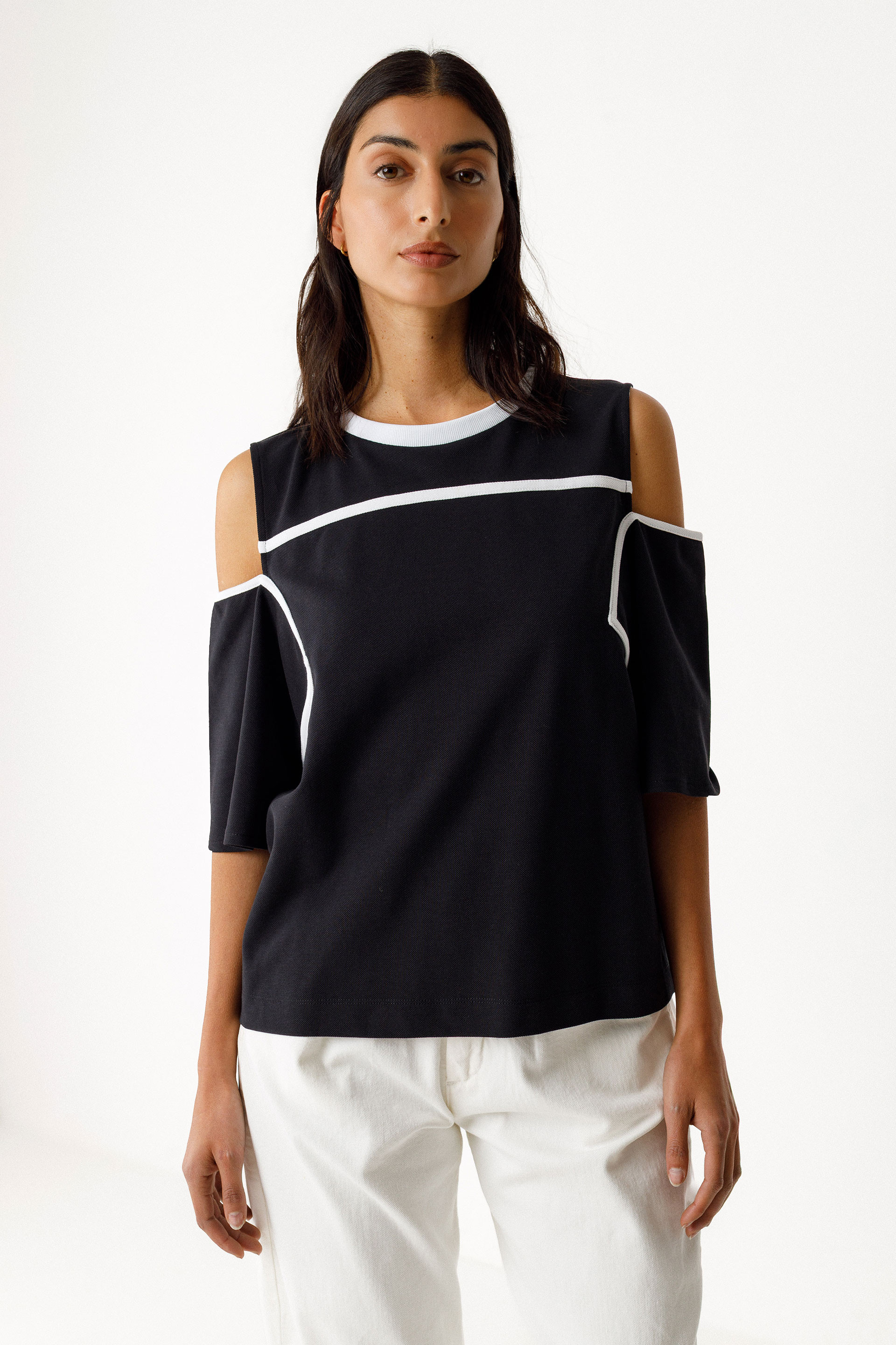 Camiseta amplia de manga corta y cuello redondo con unas pequeñas aberturas en los hombros adornadas con un pespunte en contraste.