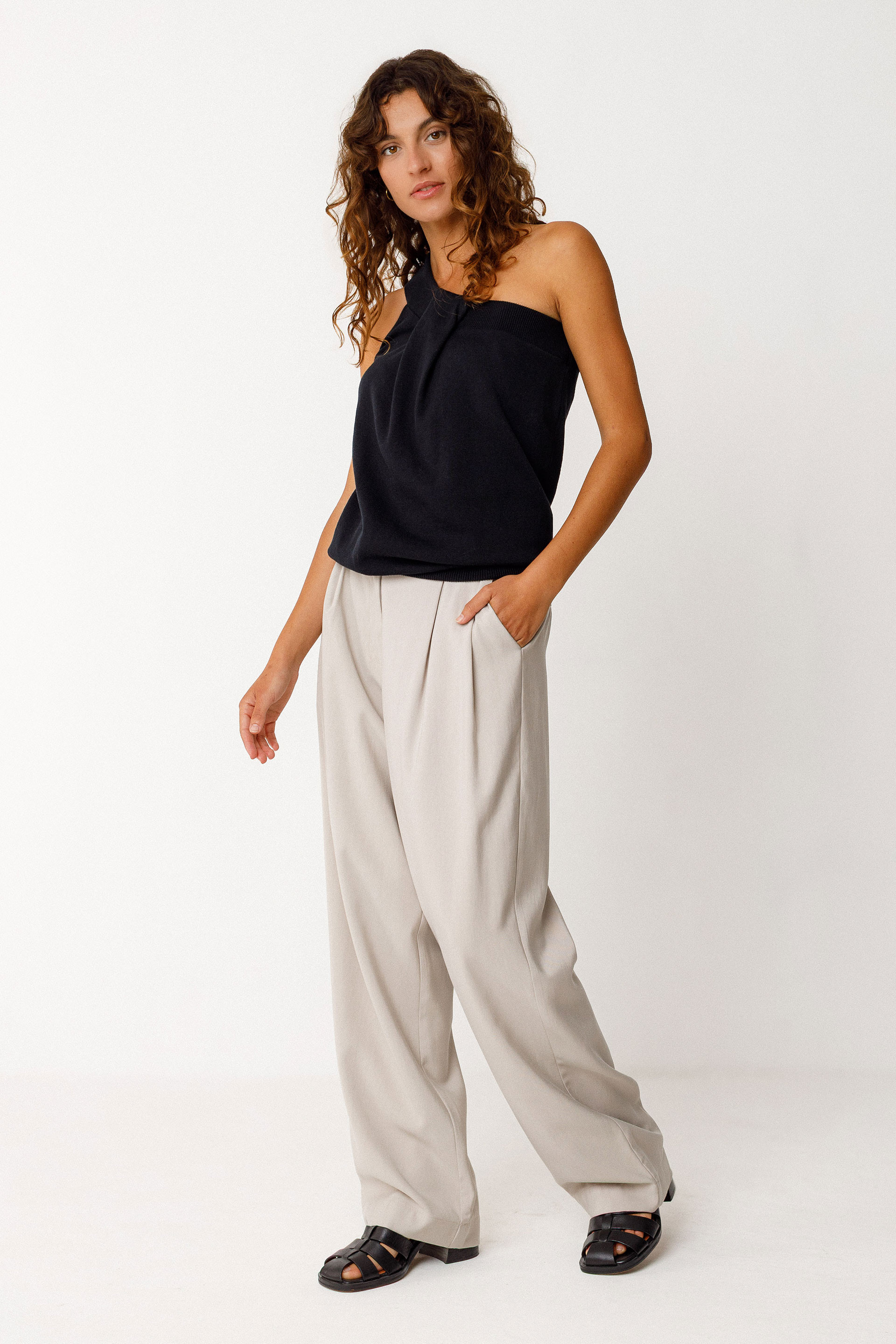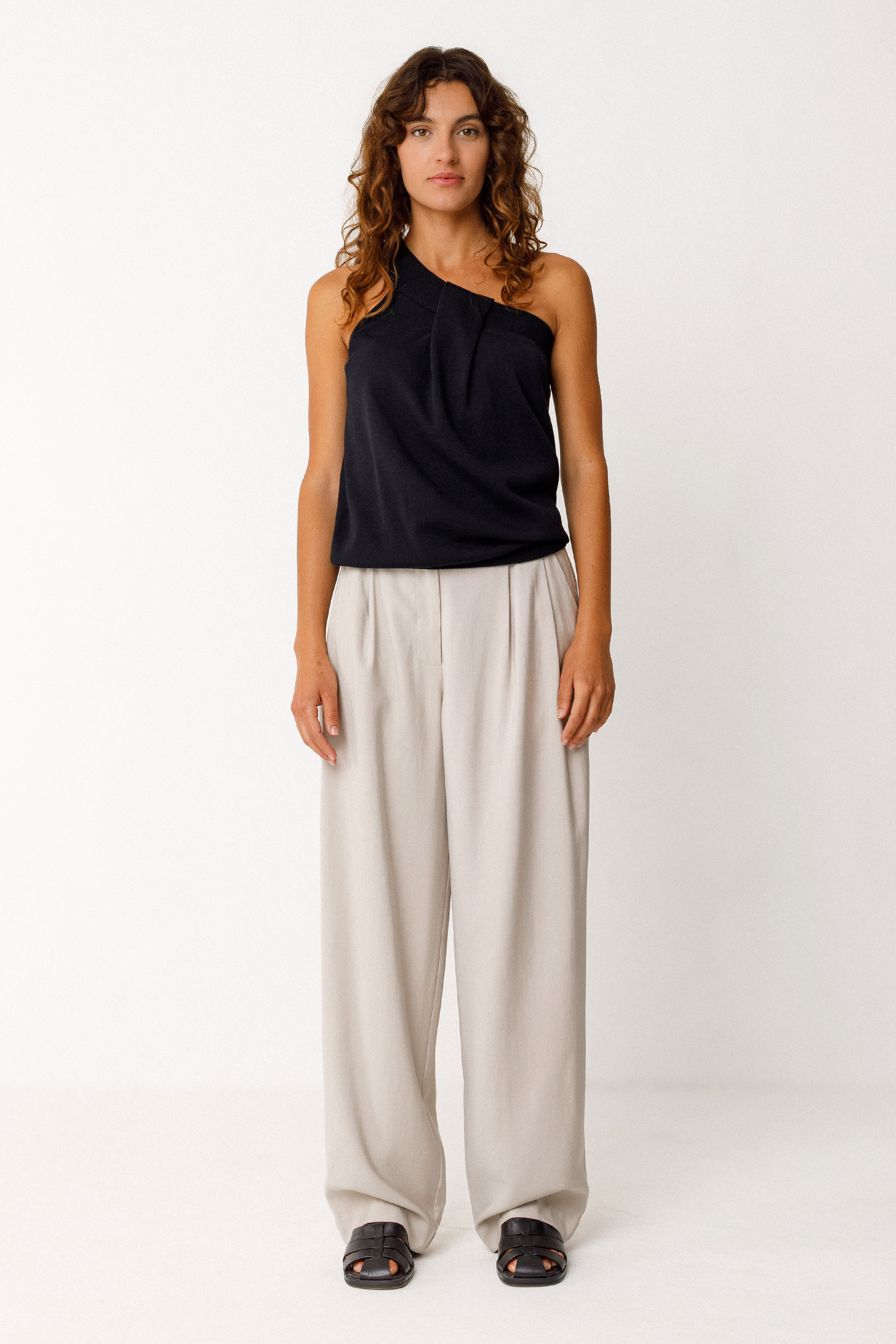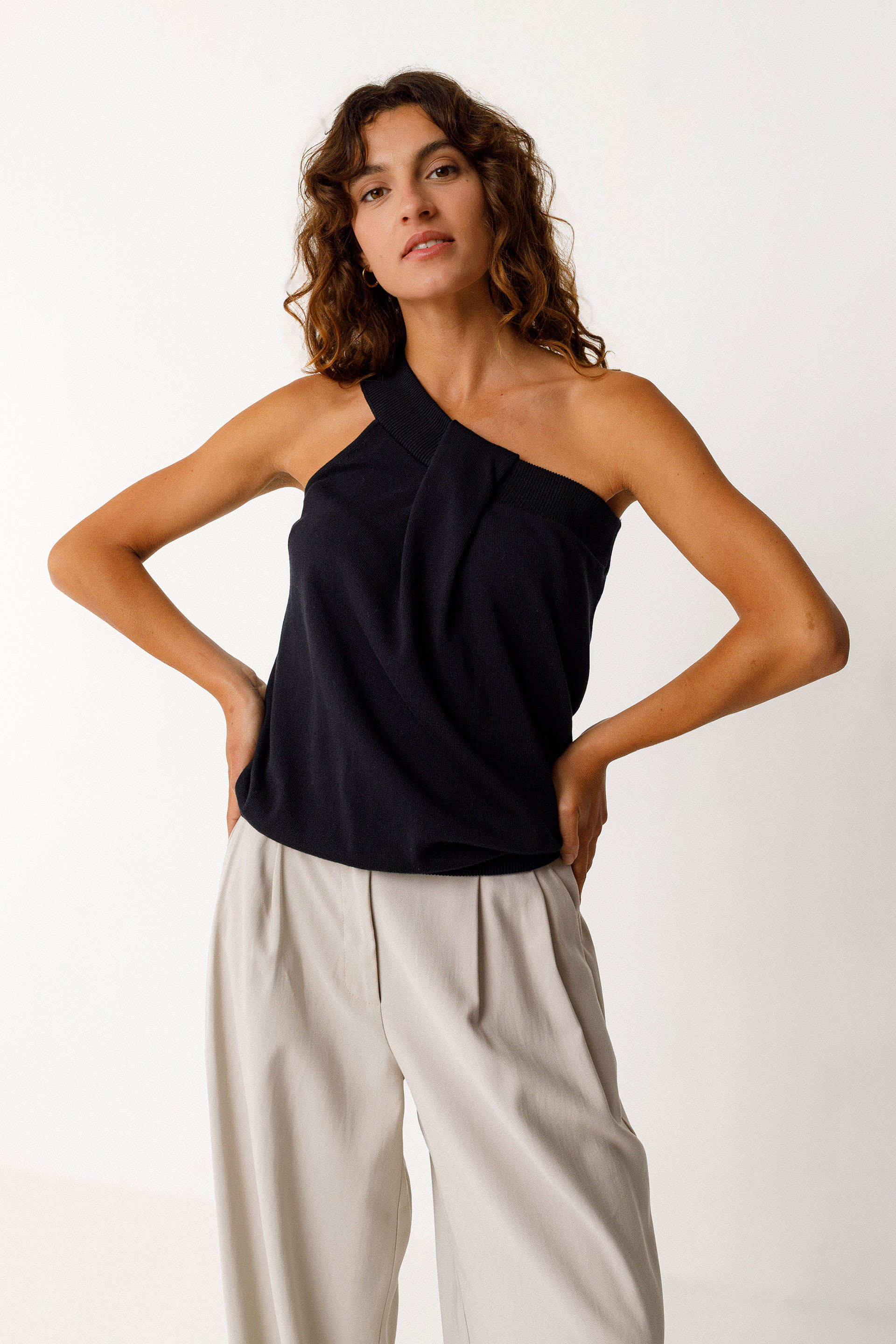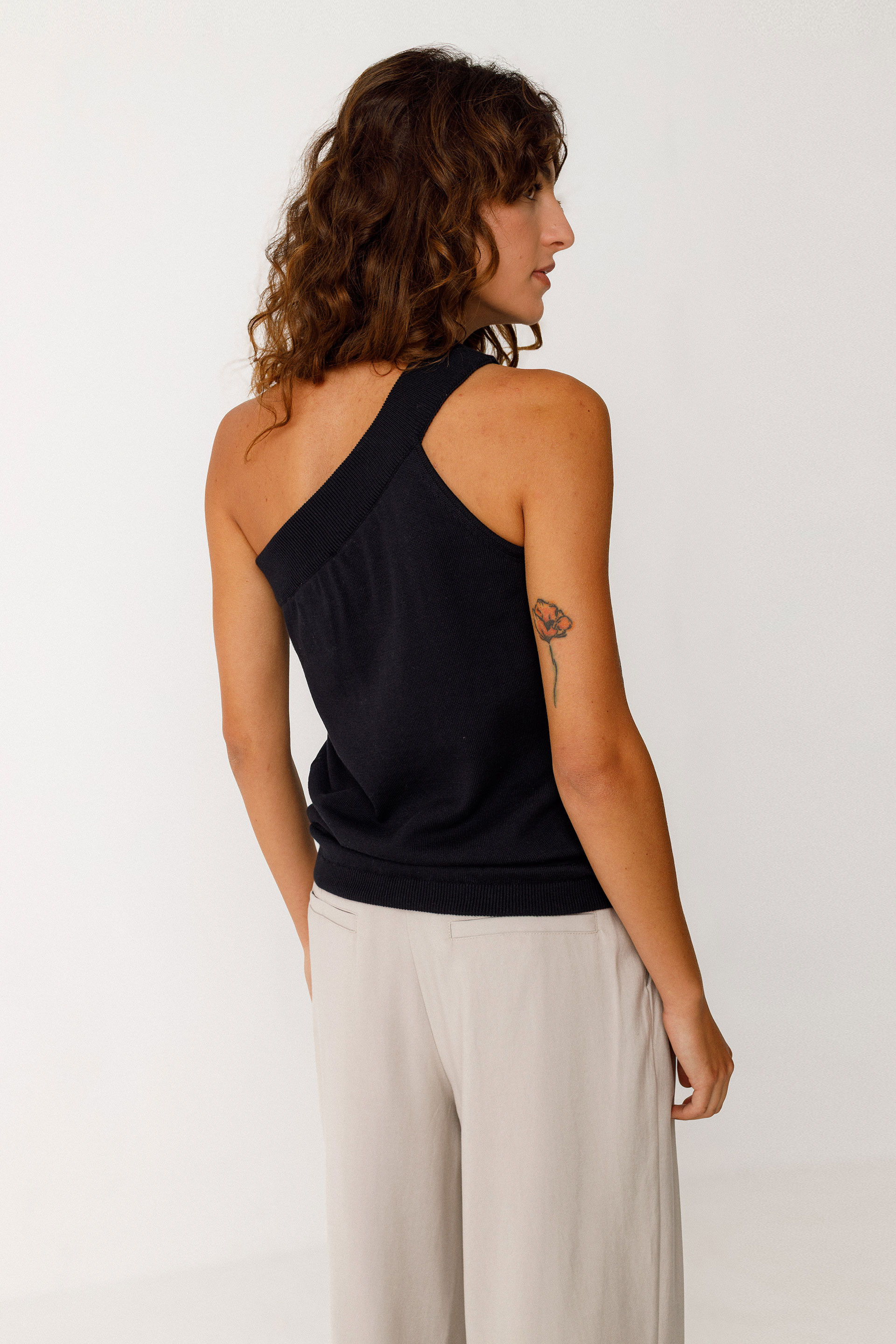 Top sin mangas de punto ligero con un hombro al aire. Remates de canalé en el escote y la cintura.