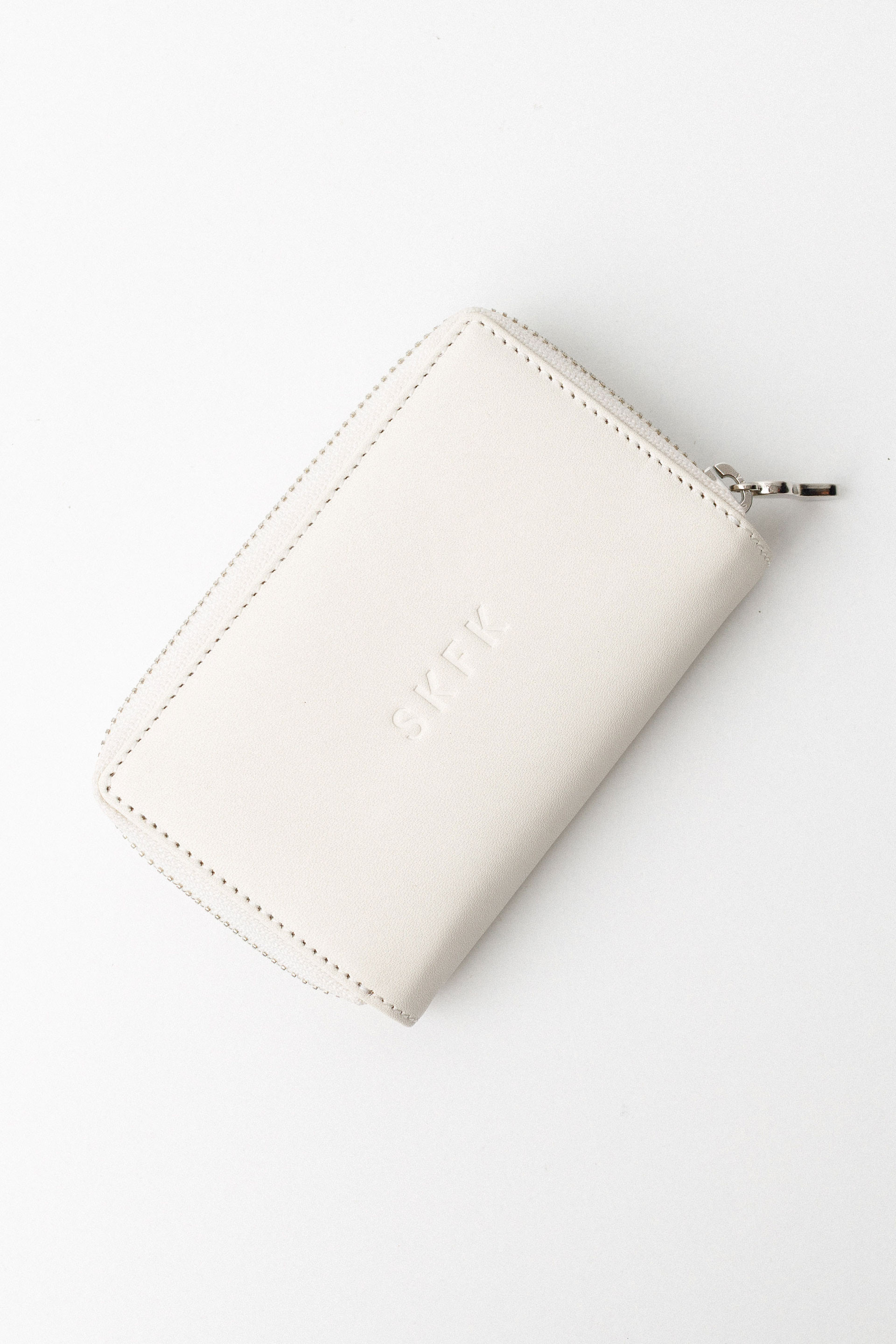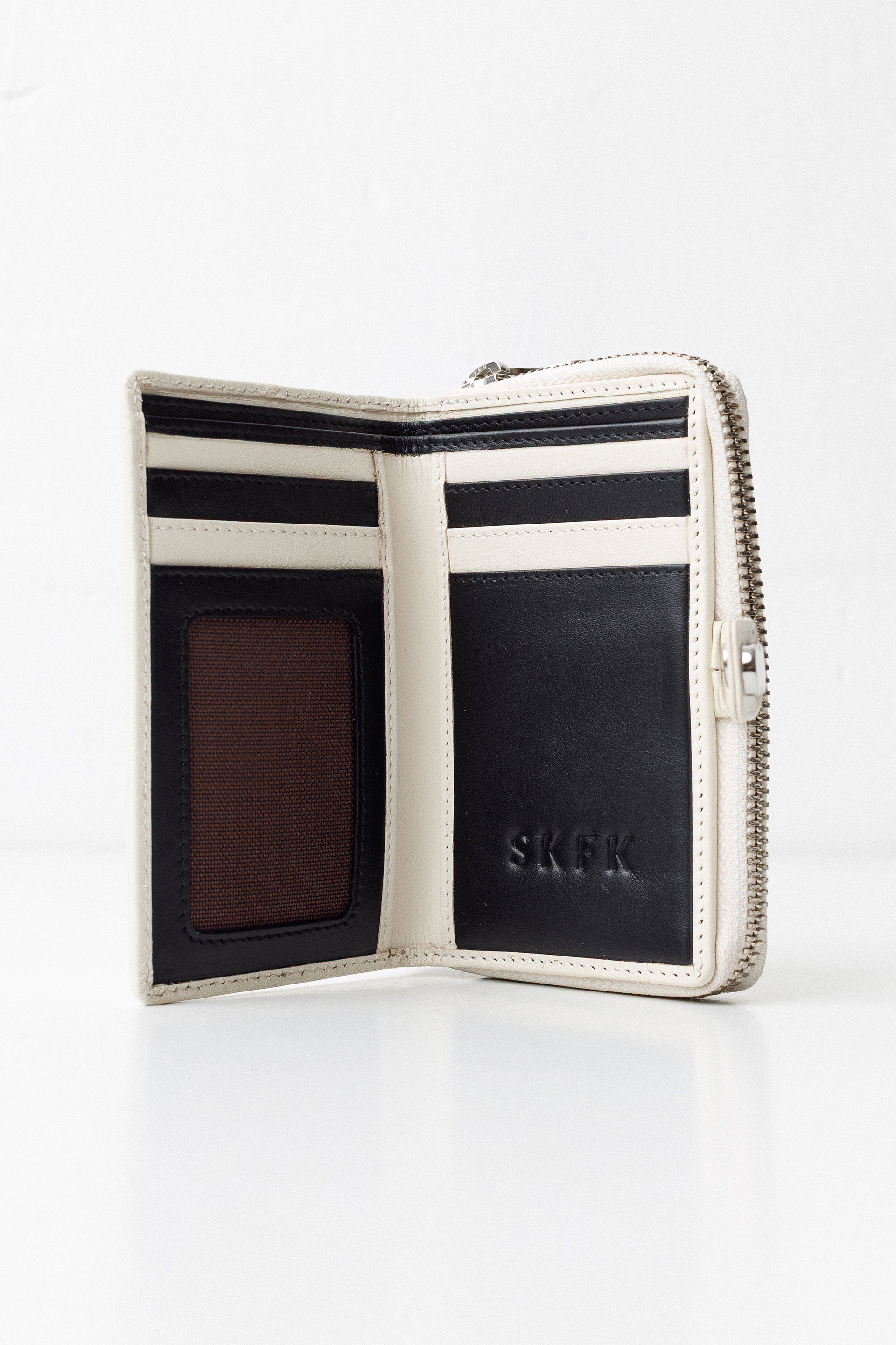 Cartera de piel con bolsillo de cremallera para las monedas. El tarjetero y el billetero se cierran con un botón a presión y una correa con efecto plisado. Mide 12,5 x 9 cm.