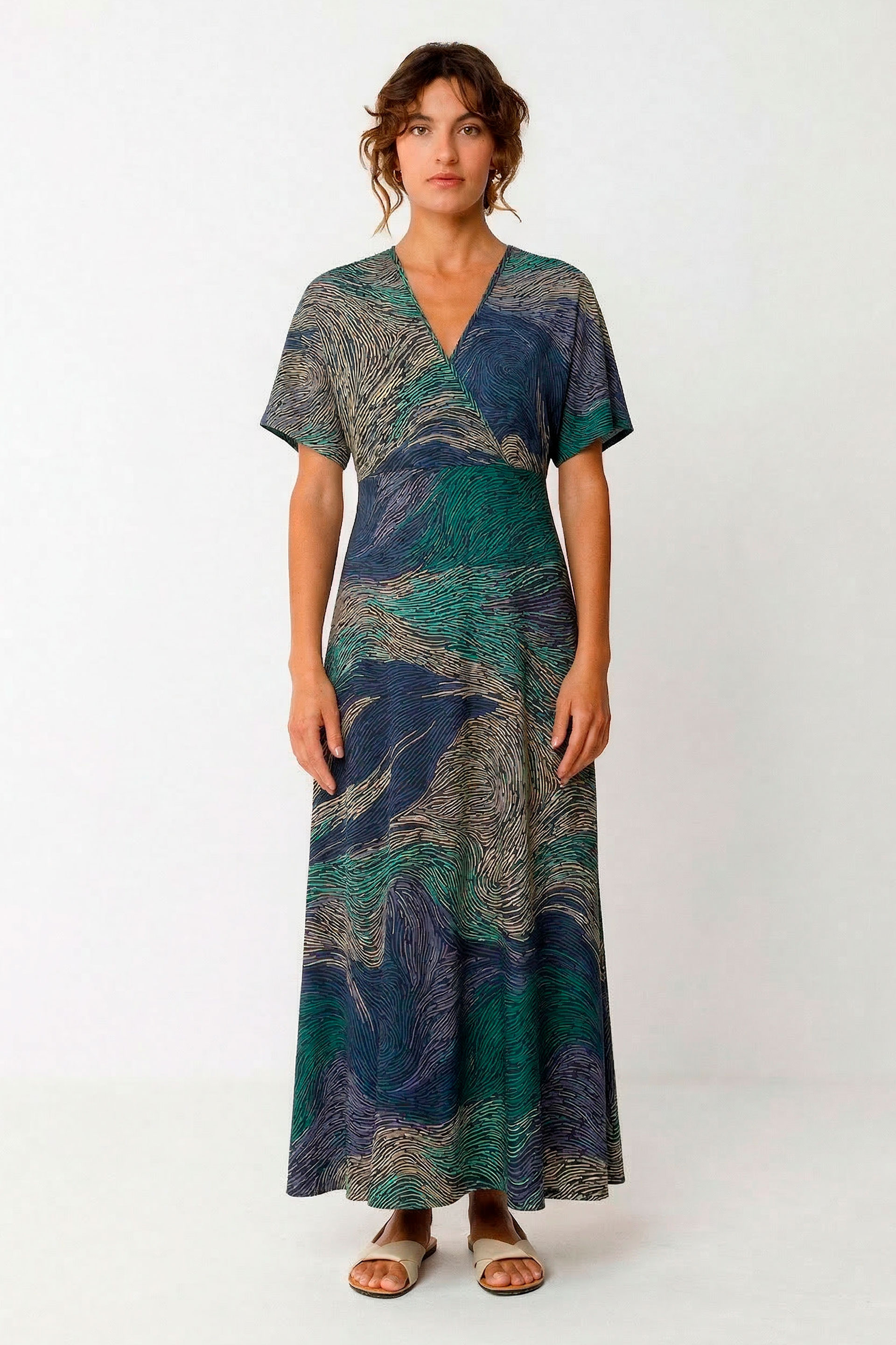 Midi kimono-soinekoa. Gerri altua eta gona barren-zabala. Eskote puntaduna eta mahuka motza.