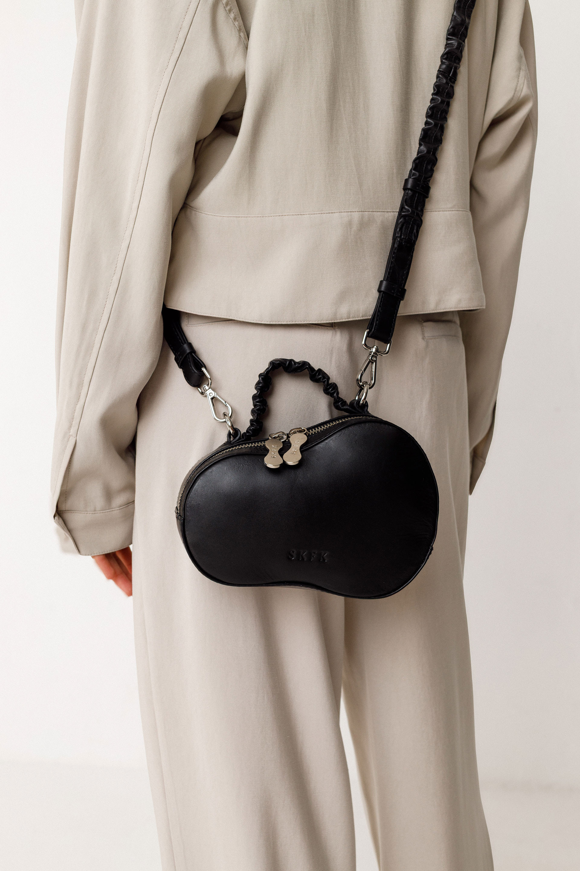 Larruzko poltsa egituratua, forma organikokoa. Heldulekuak, ixteko kremailera, kotoizko forrua eta kremaileradun poltsikoa barruan. Neurriak: 20 x 14 cm.